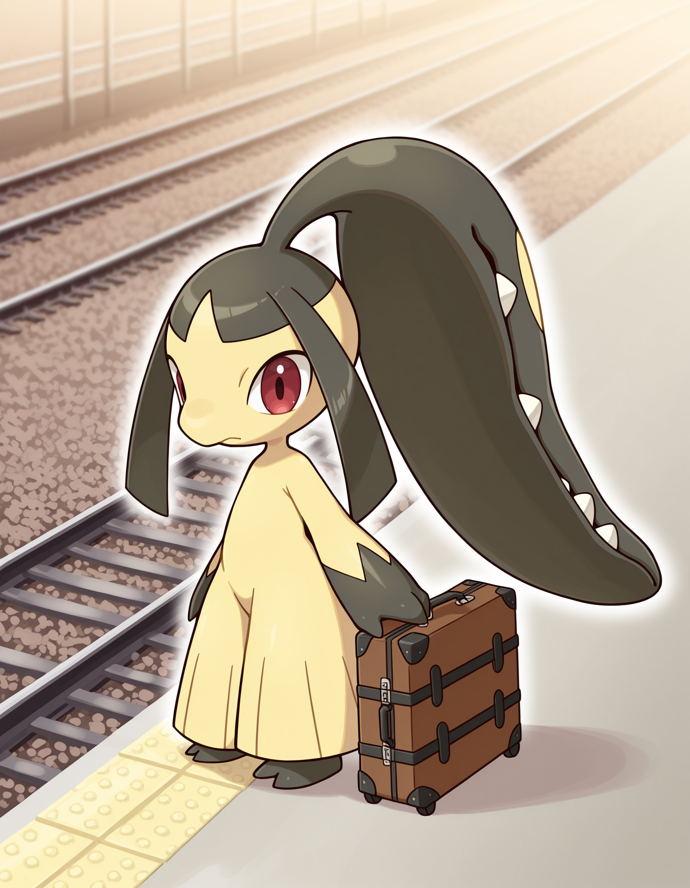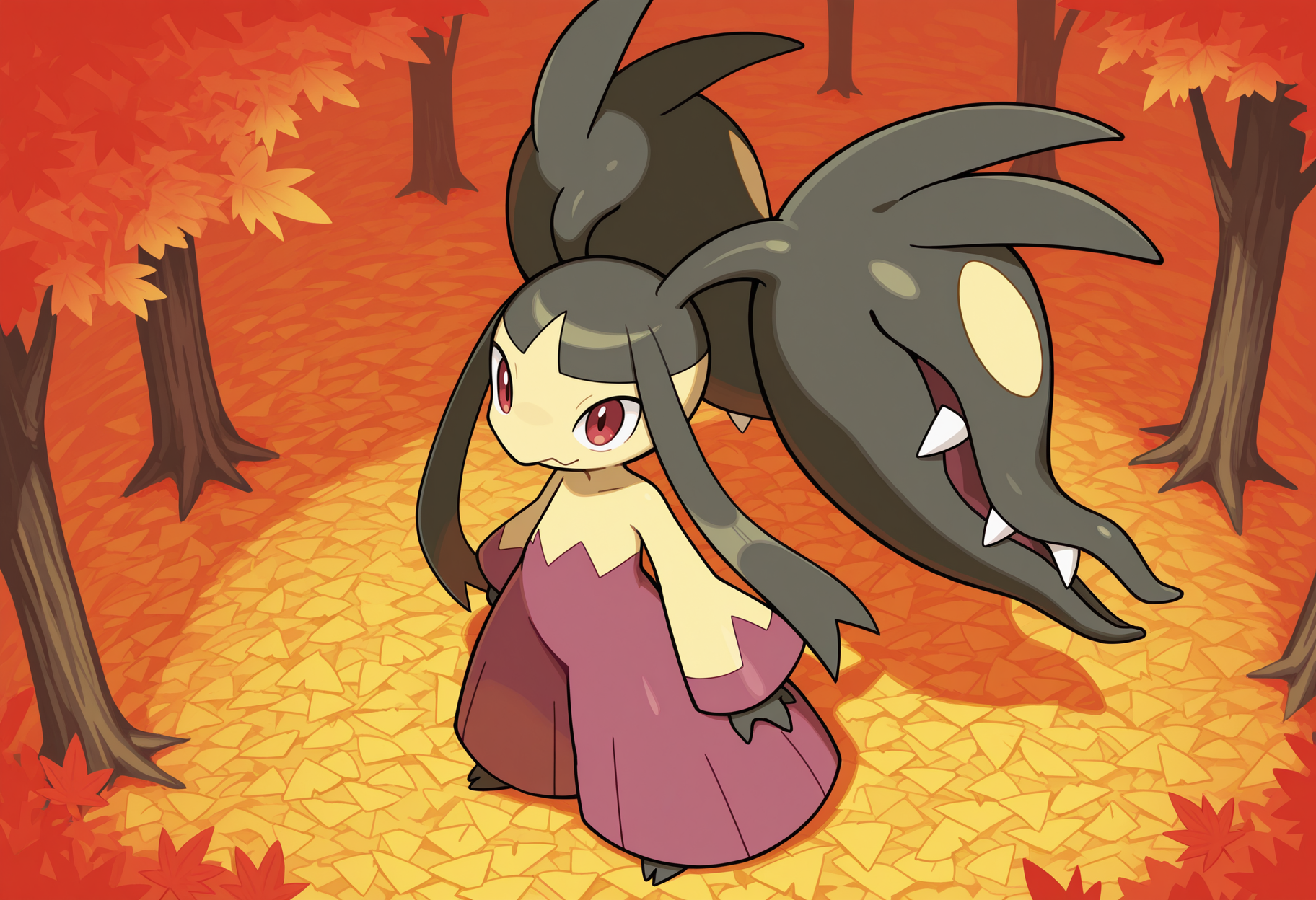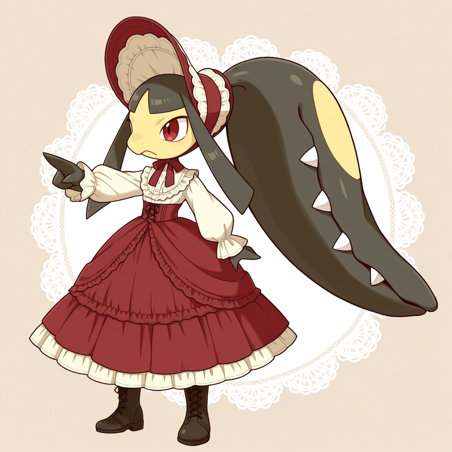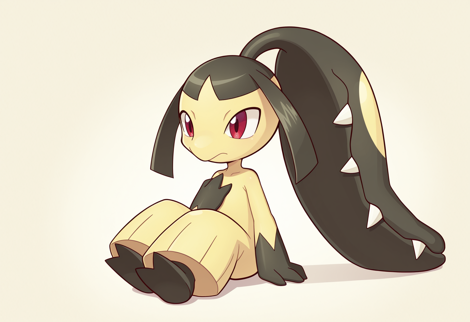 Mawile Tags: mawile, ponytail, long sidelocks, yellow skin, black hair, blunt bangs, pokemon \(creature\), red eyes, extra mouth