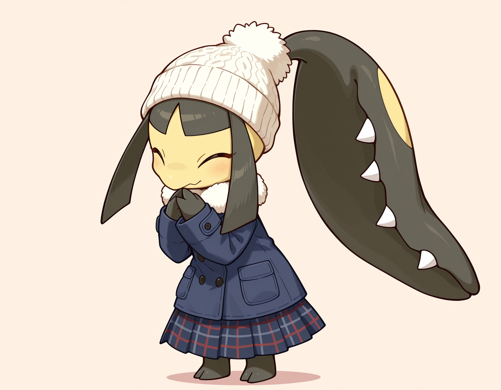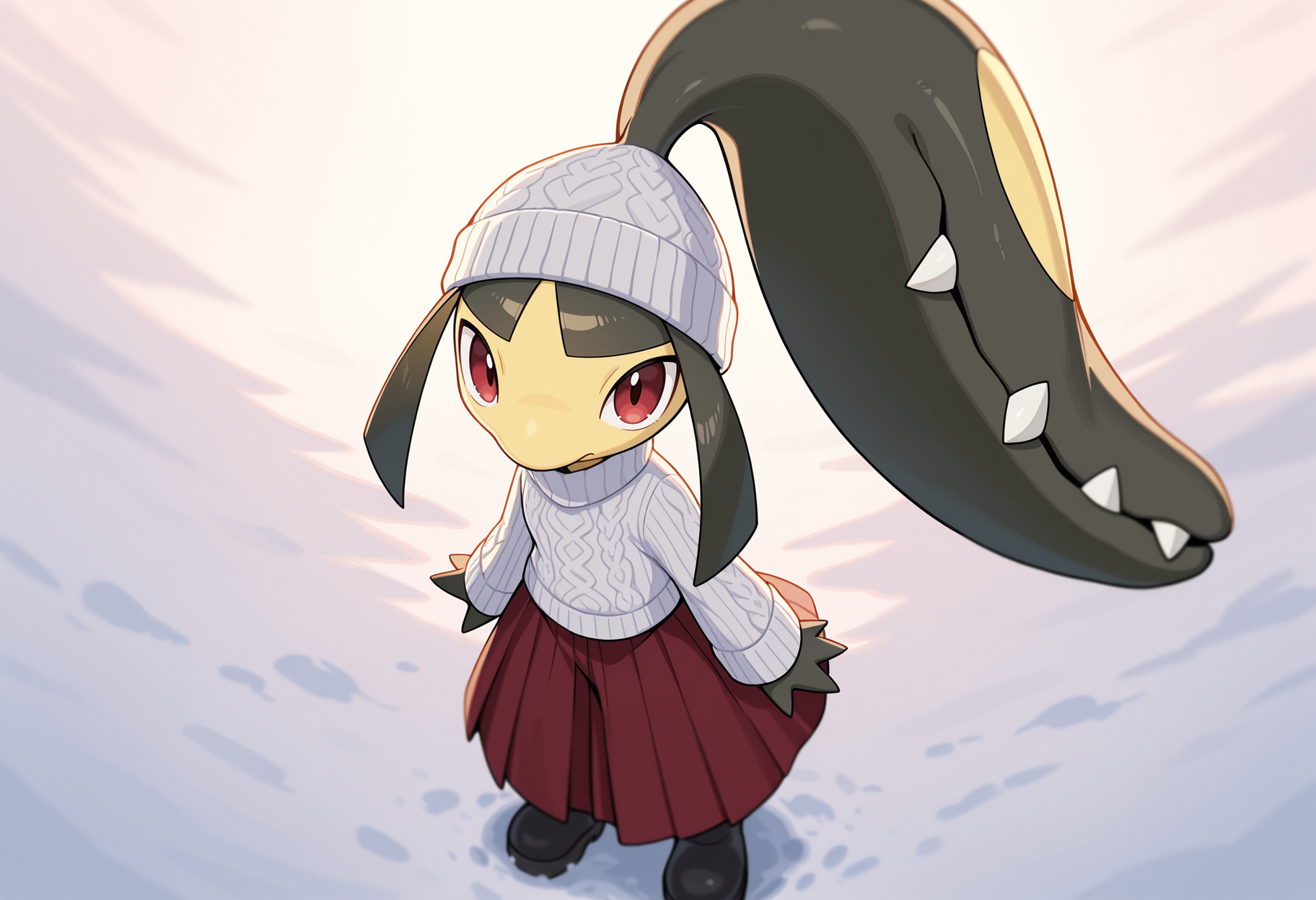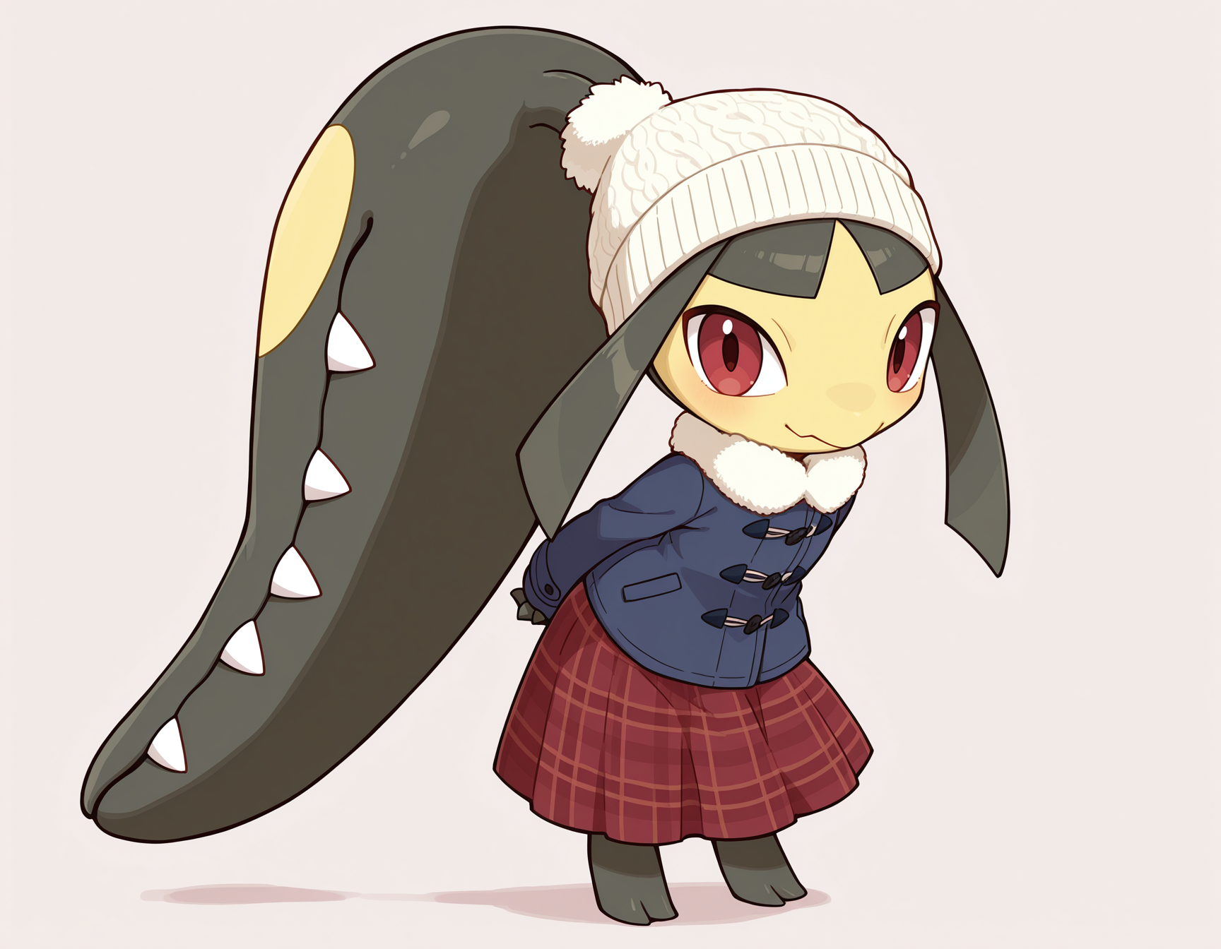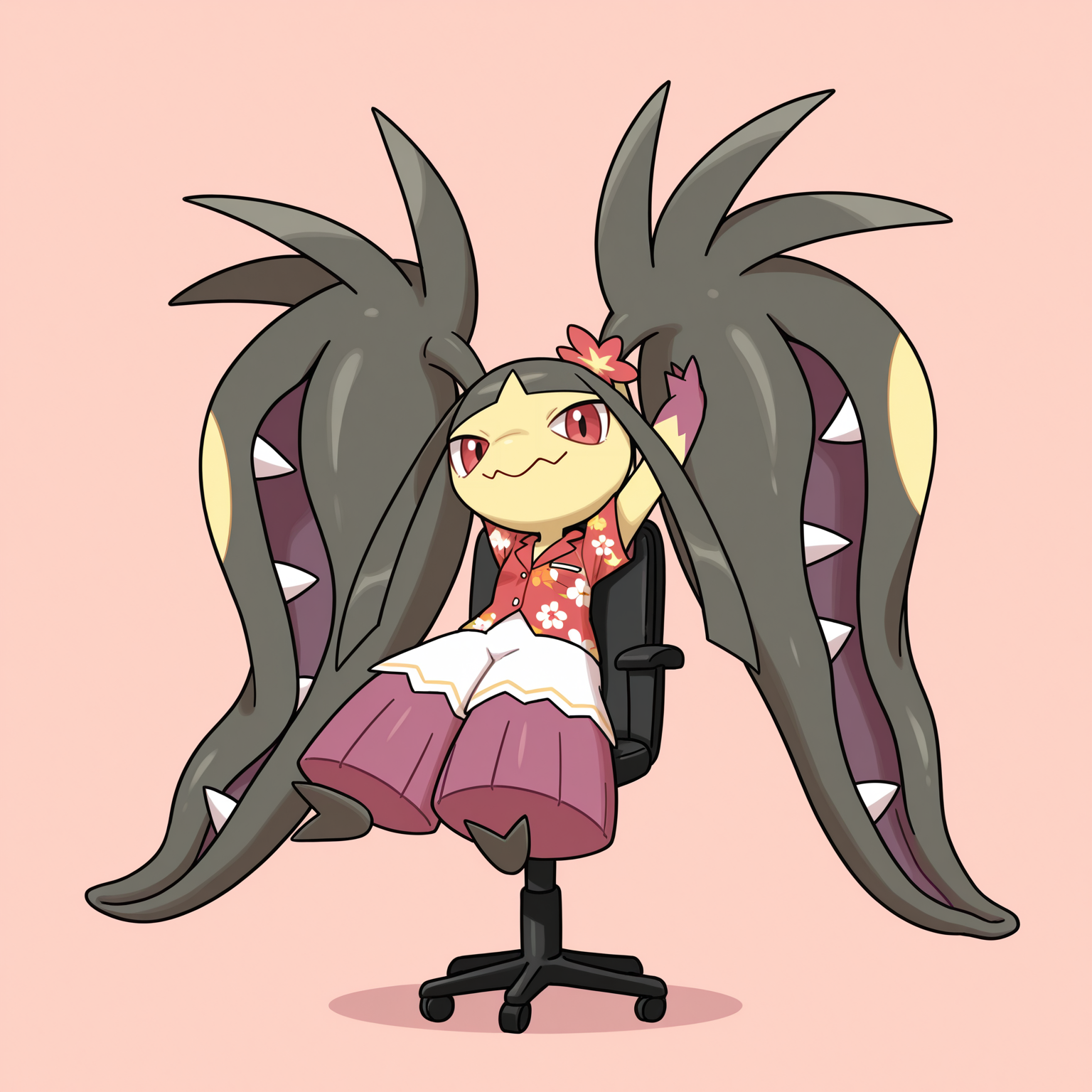 Mawile Tags: mawile, ponytail, long sidelocks, yellow skin, black hair, blunt bangs, pokemon \(creature\), red eyes, extra mouth