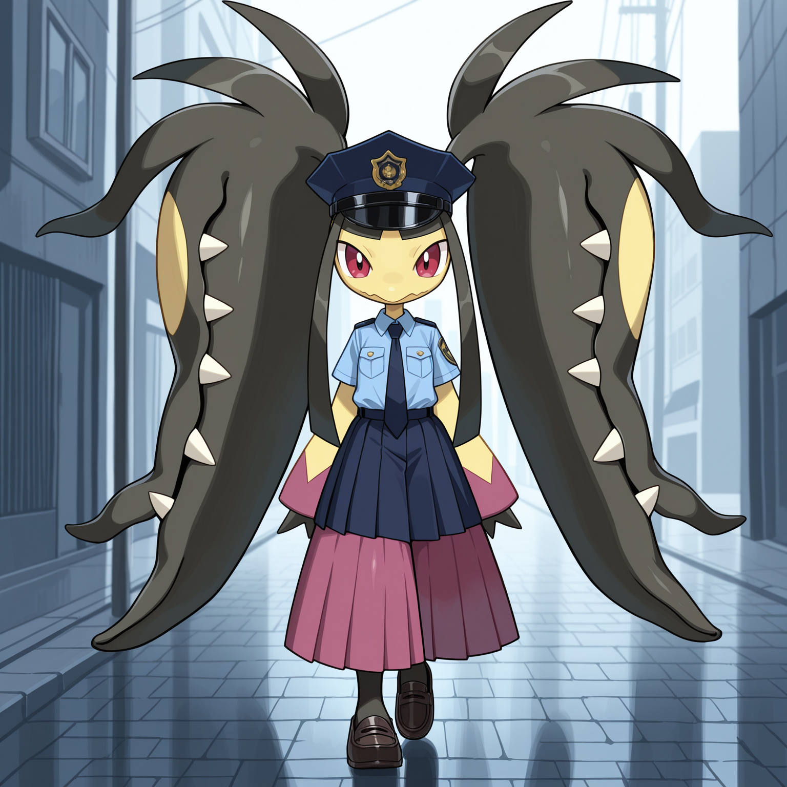 Mega Mawile Tags: mega mawile, twintails, very long sidelocks, yellow skin, black hair, blunt bangs, pokemon \(creature\), red eyes, extra mouth