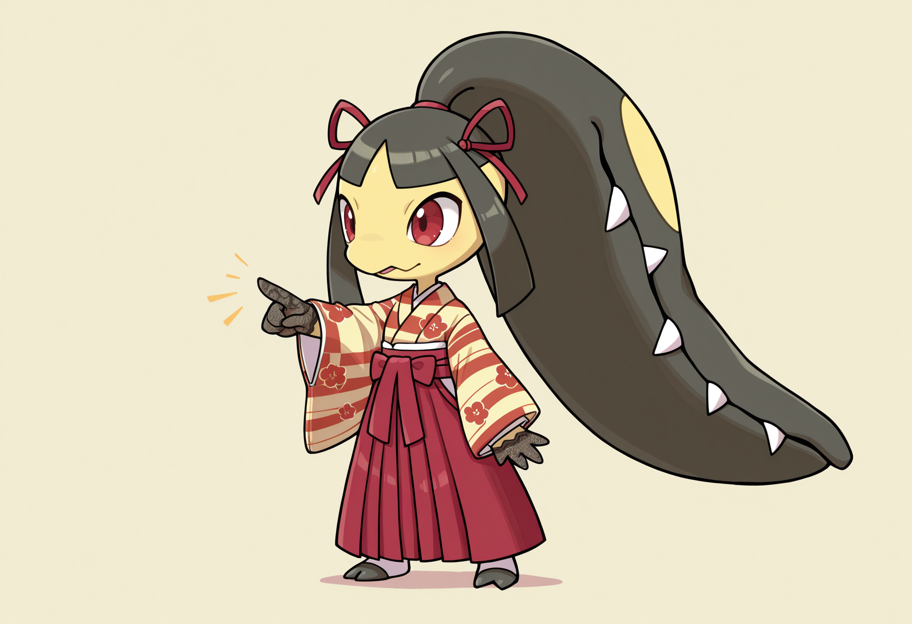 mawile, ponytail, long sidelocks, yellow skin, black hair, blunt bangs, pokemon \(creature\), red eyes, extra mouth