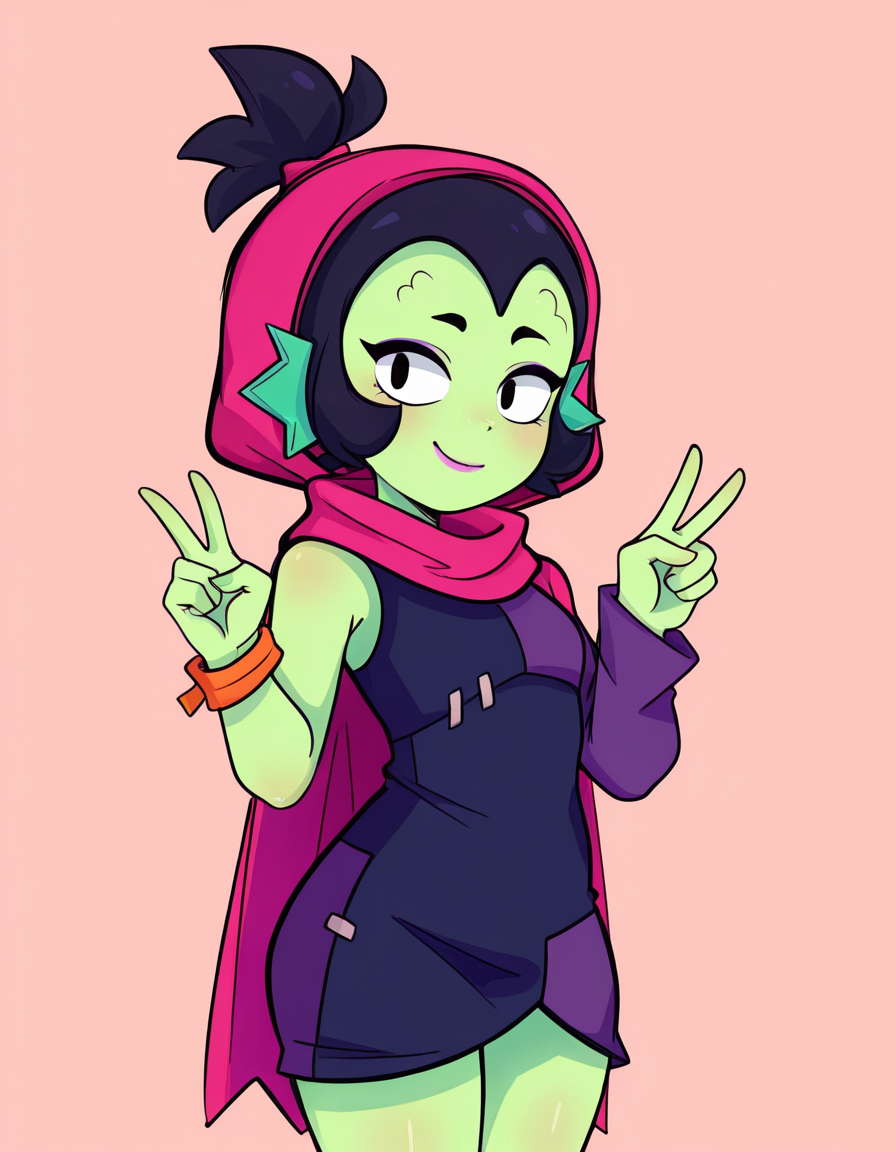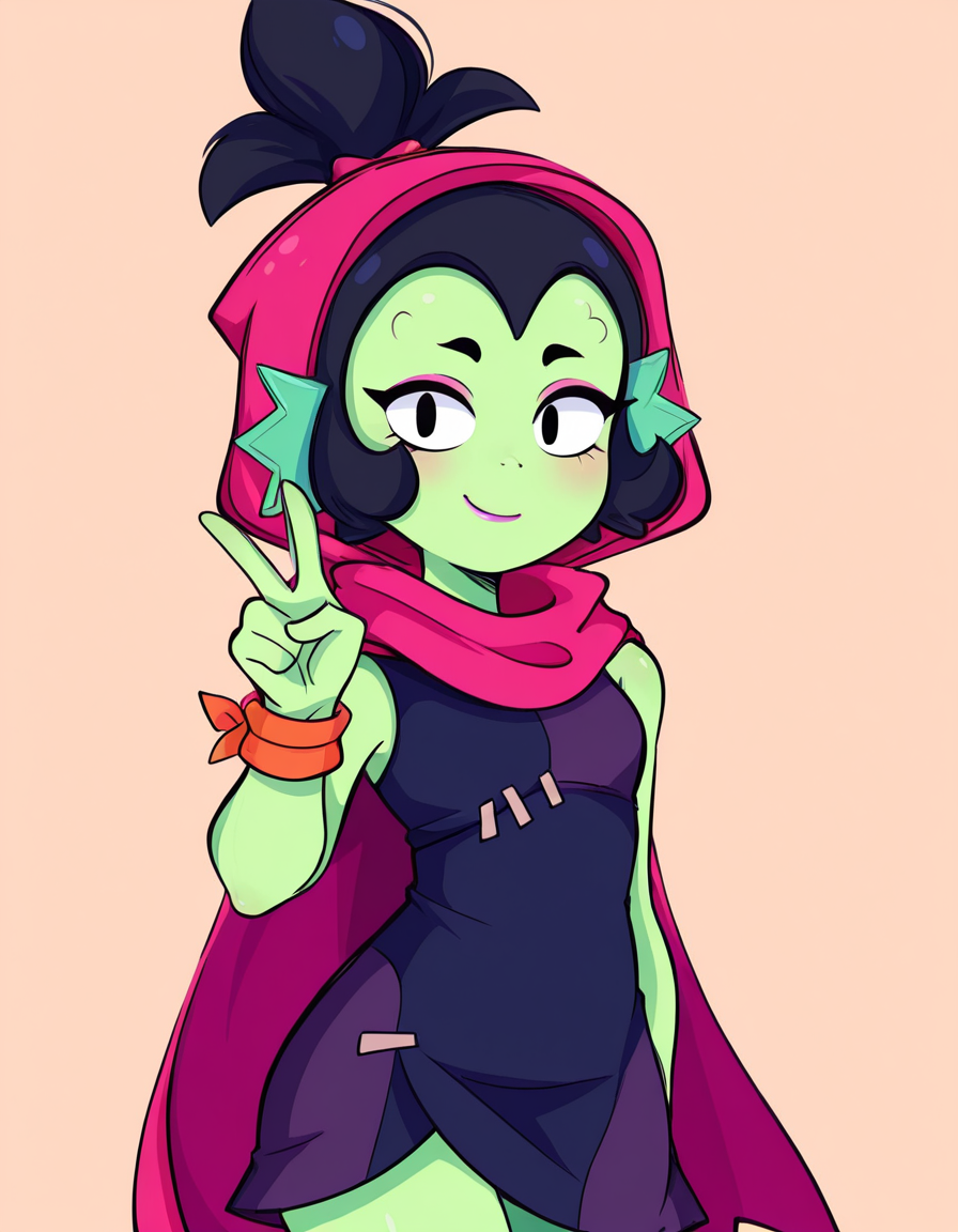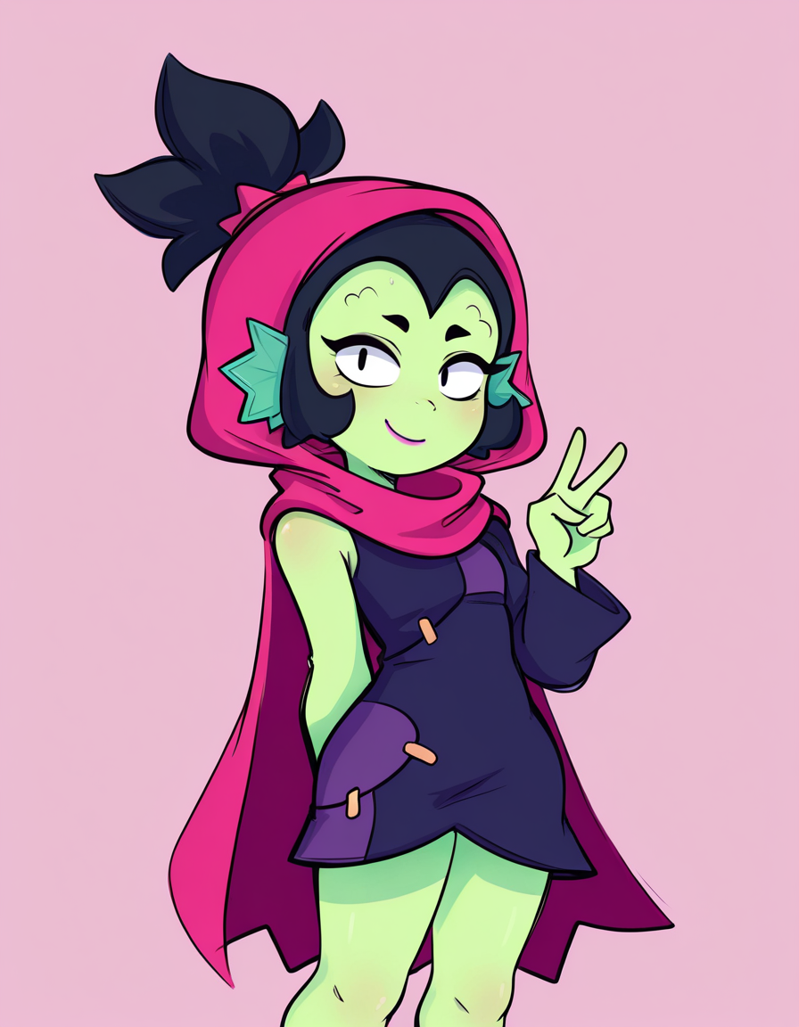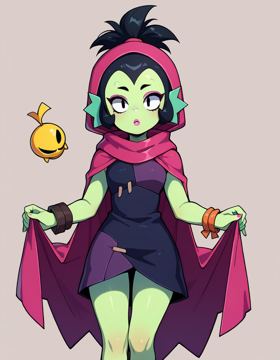 bswillow, 1girl, colored_skin, green_skin ,fish girl, pink lips, pink hood,black eyes , black_hair, cape, ponytail, scarf, dress