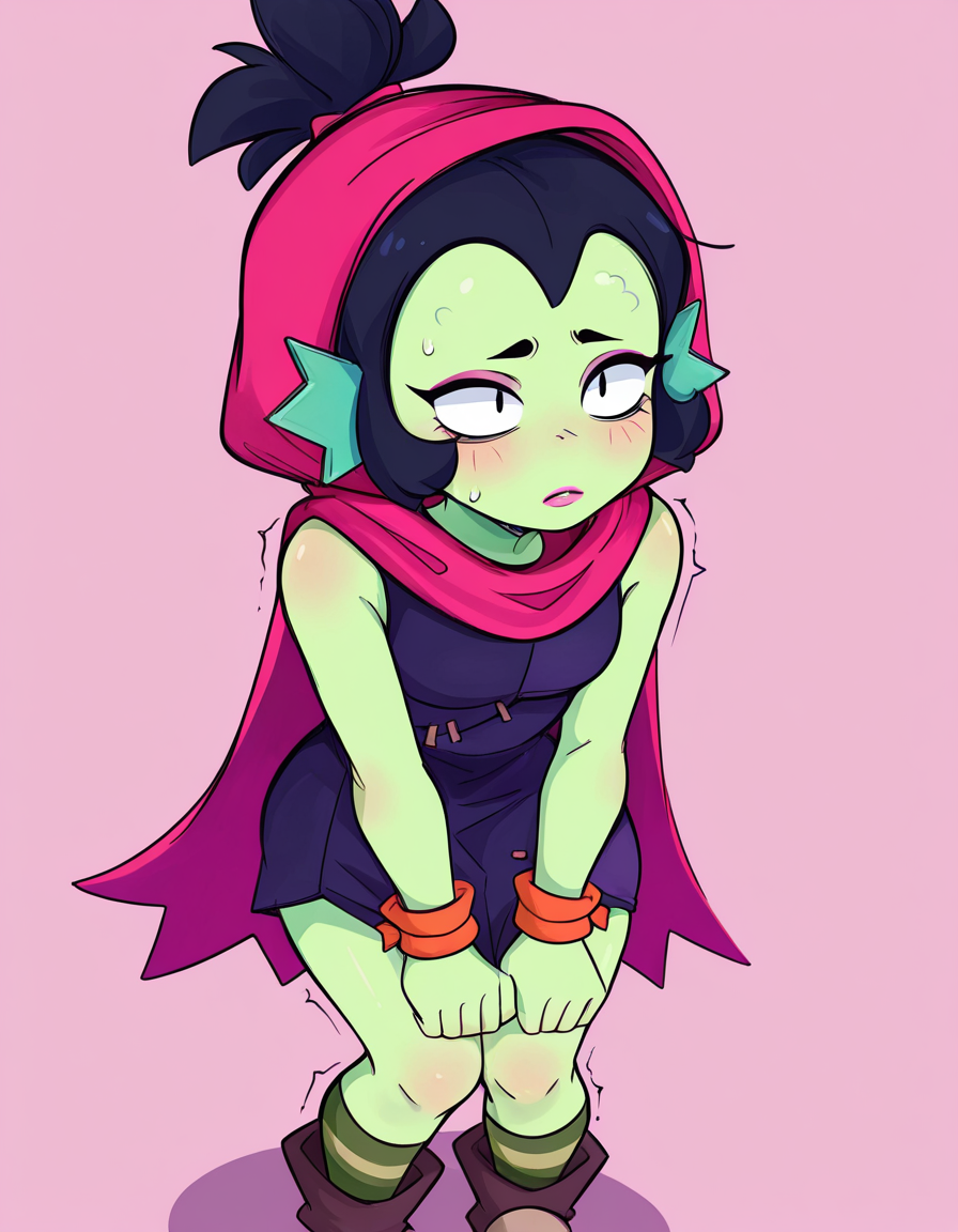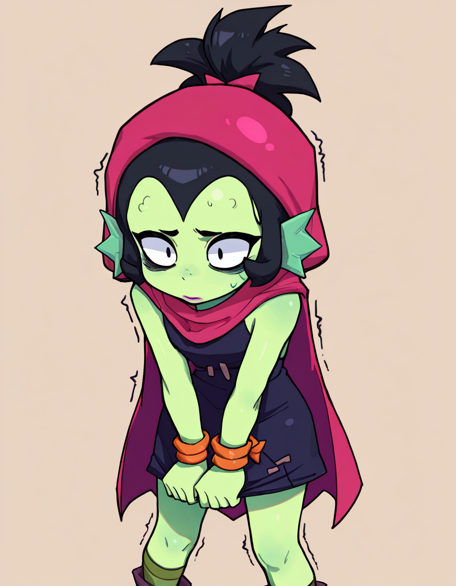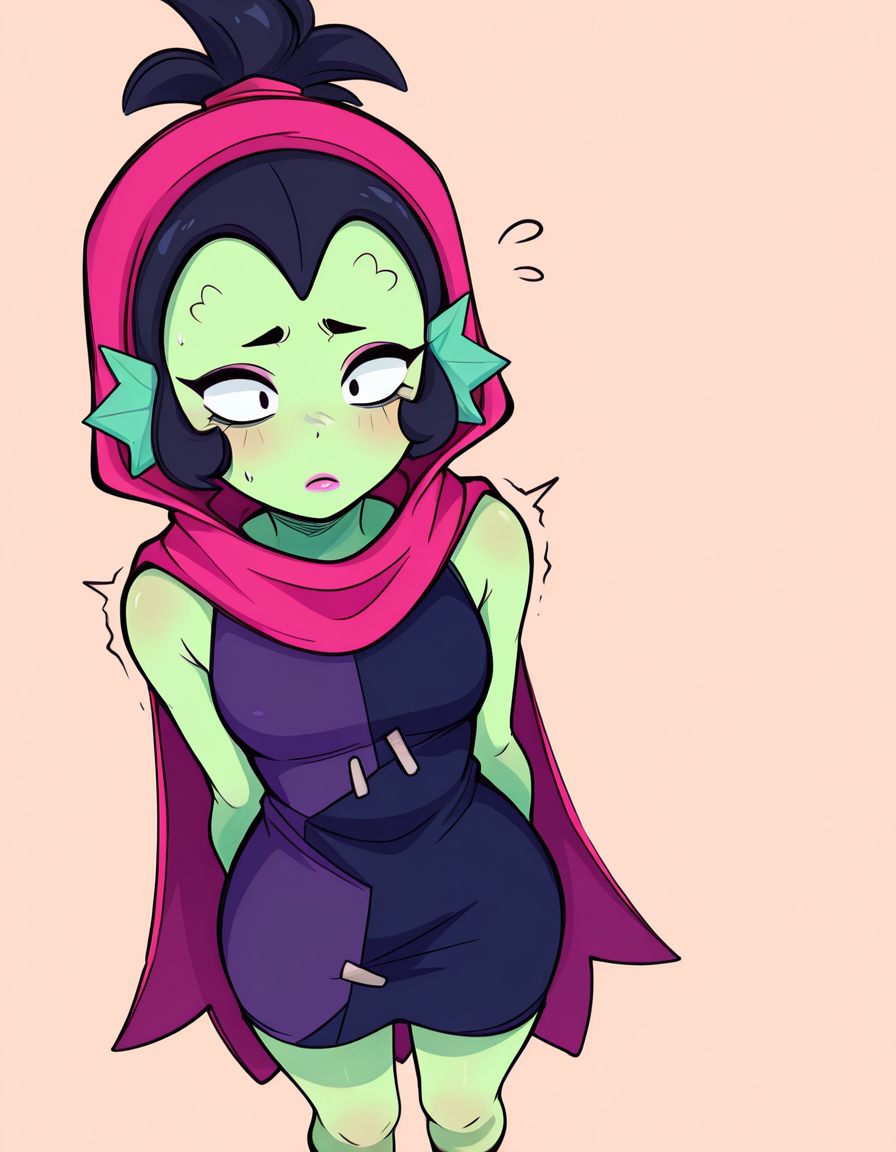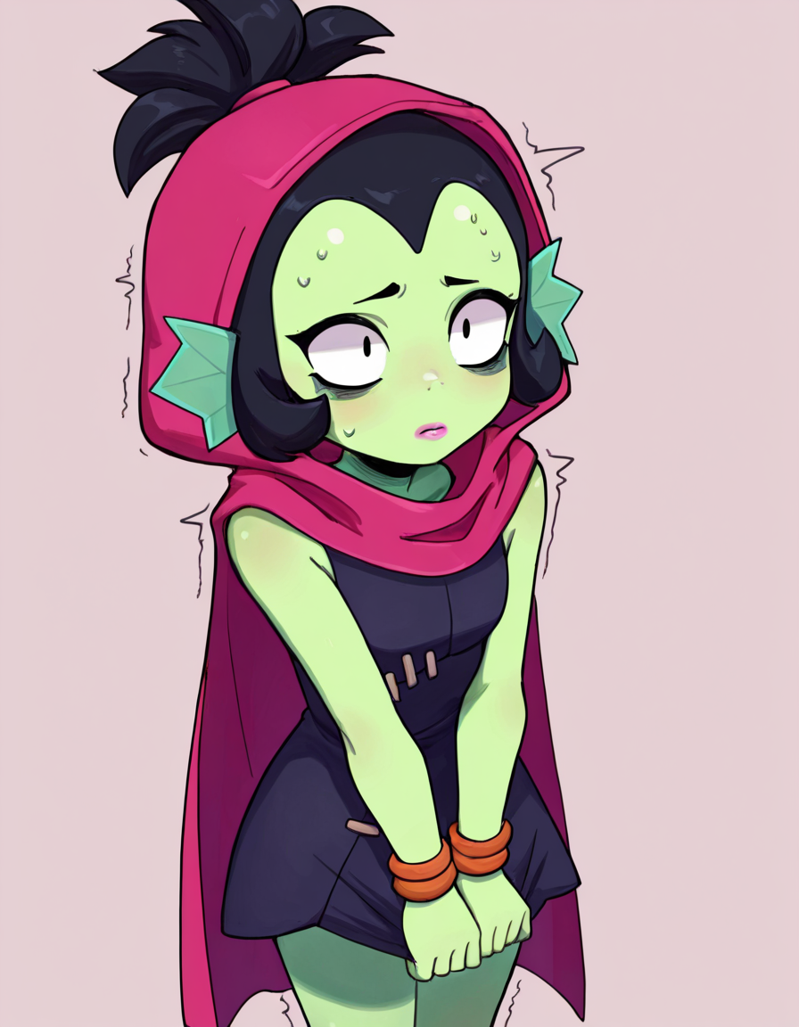bswillow, 1girl, colored_skin, green_skin ,fish girl, pink lips, pink hood,black eyes , black_hair, cape, ponytail, scarf, dress