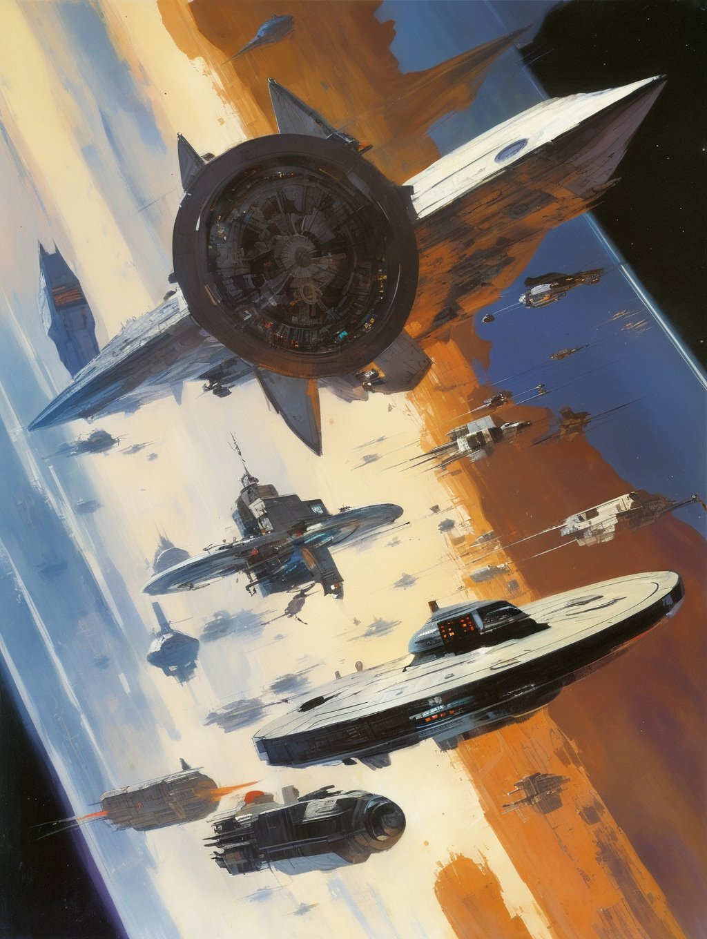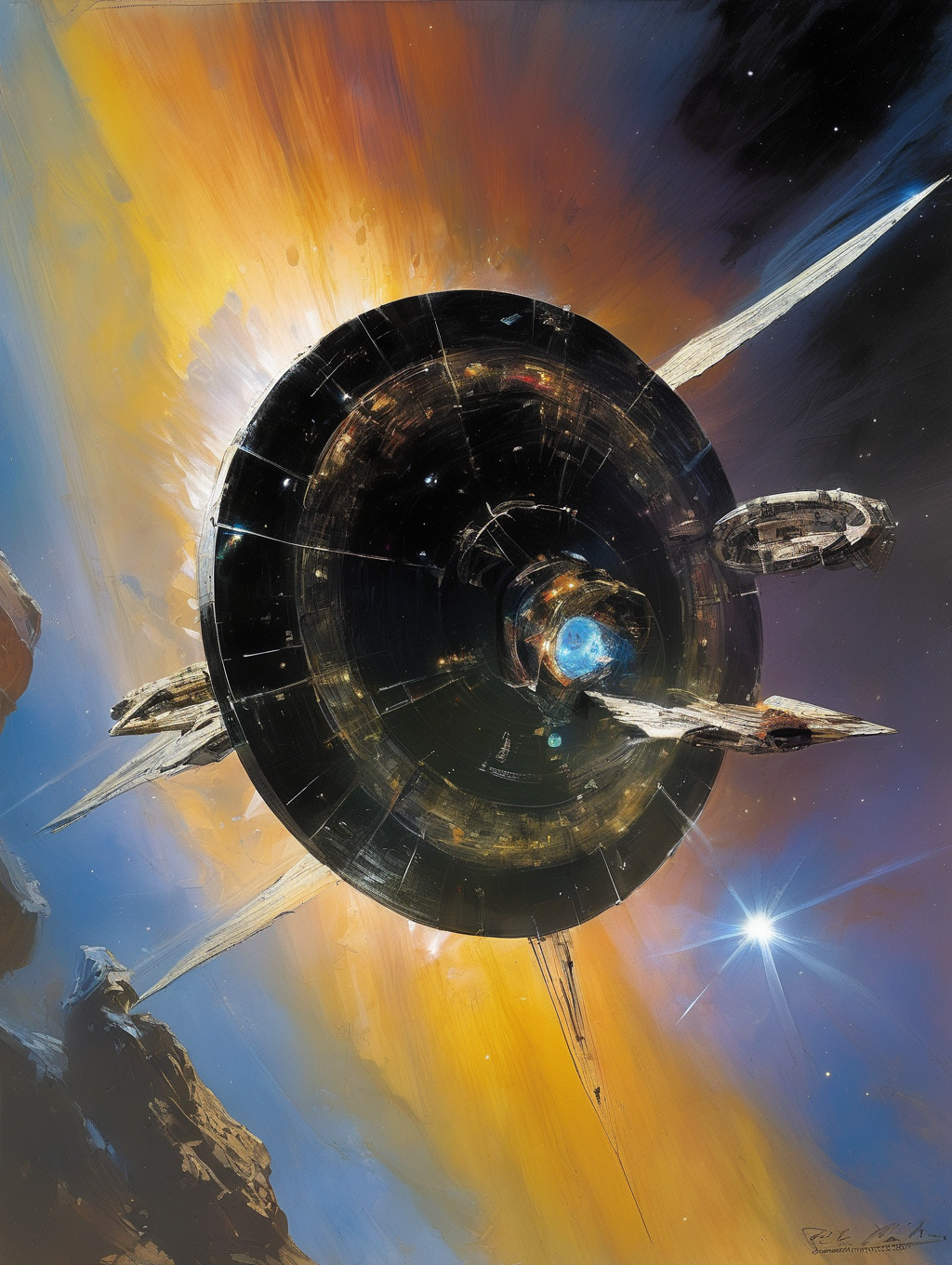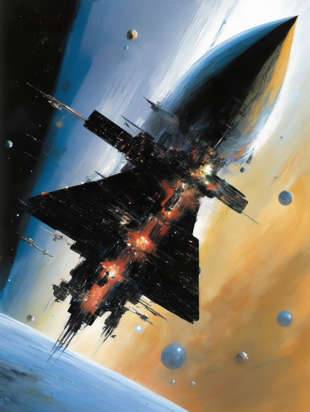 Berkey had a unique ability to create a sense of scale and depth in his paintings. He often portrayed colossal spaceships, celestial bodies, and vast expanses of space, creating a feeling of awe and the vastness of the cosmos.