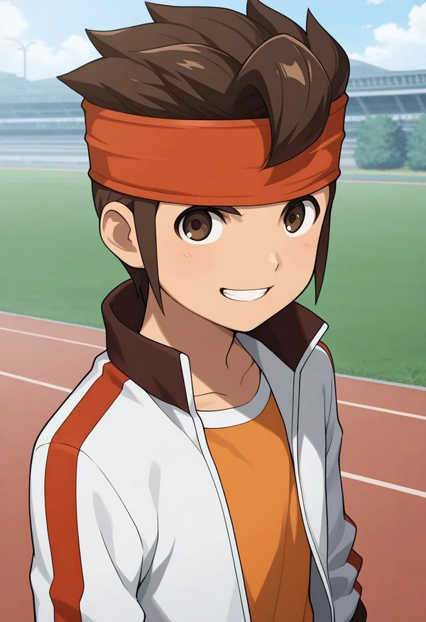 endou, 1boy, male focus, solo, headband, brown hair, brown eyes, jacket, pants, open jacket, track jacket, orange shirt, blue pants,