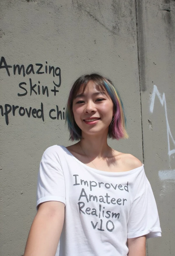 v10: Changed dataset and training config again. Much more real-looking and more consistent amateur realism. Amazing skin details and further improved chins. Great text writing ability.