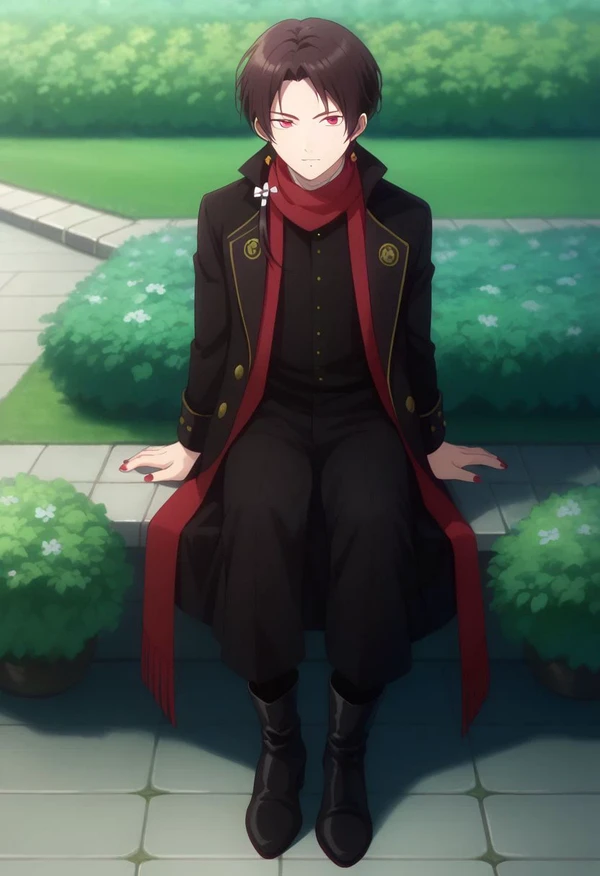#2 - kashuu, male focus, 1boy, red eyes, mole under mouth, high heels, ponytail, high heel boots, scarf, boots, earrings, nail polish, jewelry, brown hair, red nails, mole,