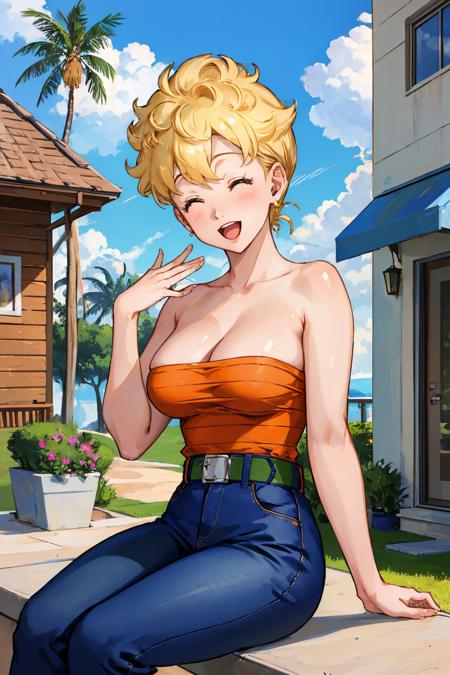 Add "orange shirt, strapless, belt, blue pants" for her typical look.