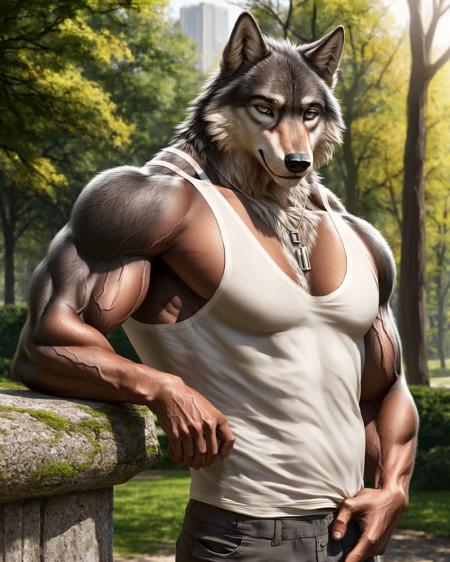 anthro (white wolf), male, adult, muscular, veiny muscles, shorts, tail, (realistic fur, detailed fur texture:1.2), detailed background, outside background, photorealistic, hyperrealistic, ultradetailed,