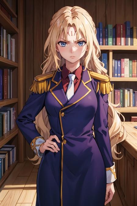 Add "epaulettes, purple uniform, forehead mark, necktie" for her typical look.