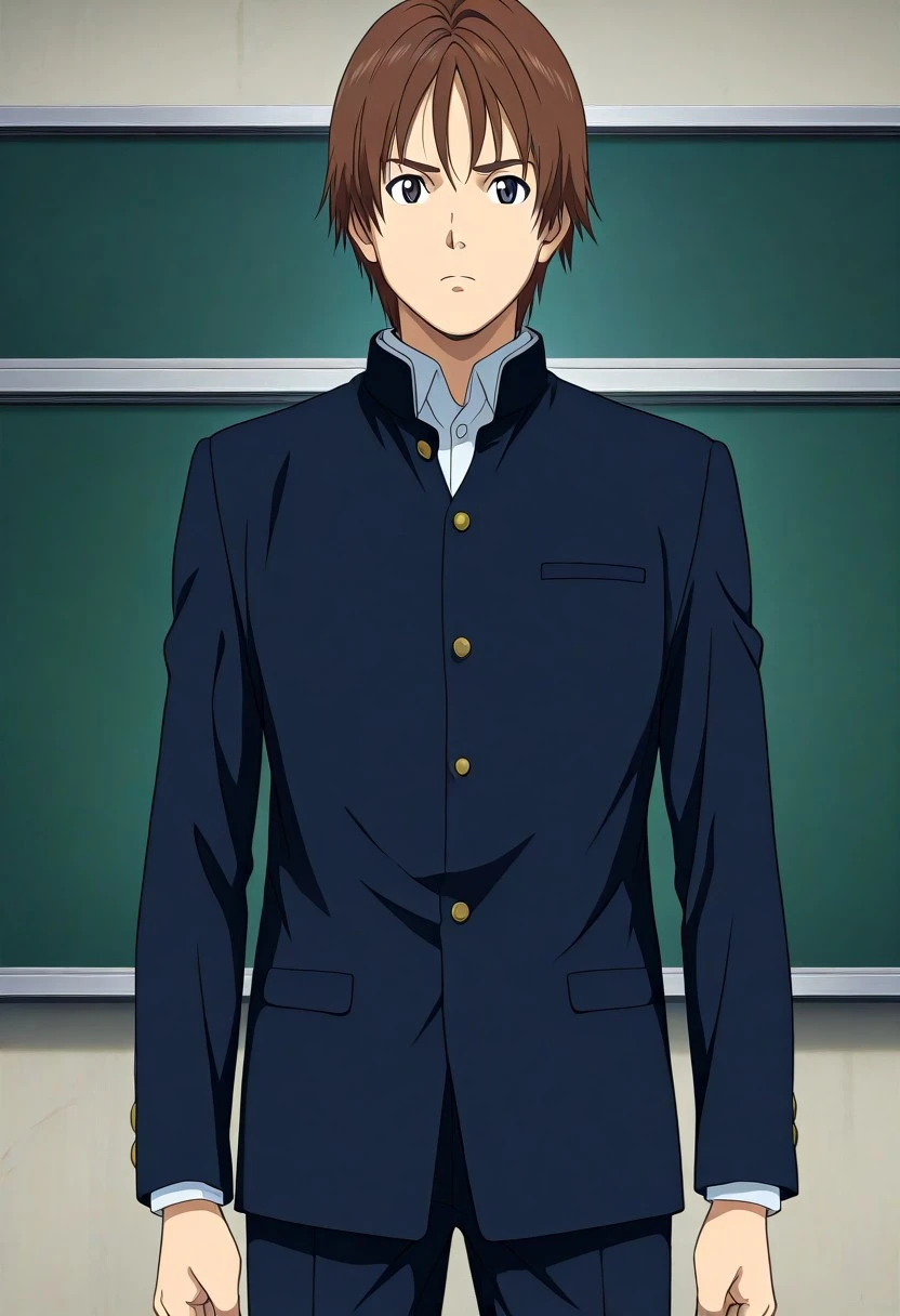 Kei Kurono, brown hair, gray-black eyes, blue gakuran uniform