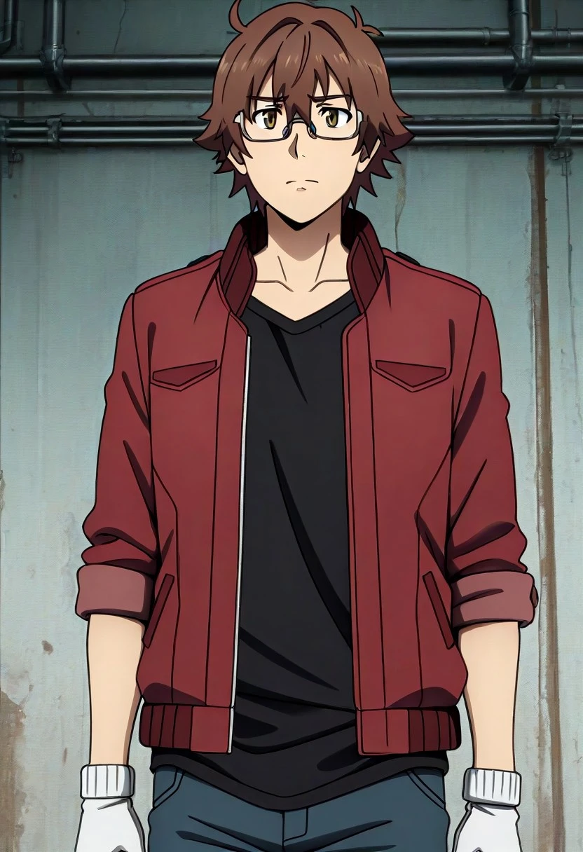 AA2153, brown hair, ahoge, yellow-brown eyes, glasses, red cap, black shirt, red jacket, white gloves, blue pants