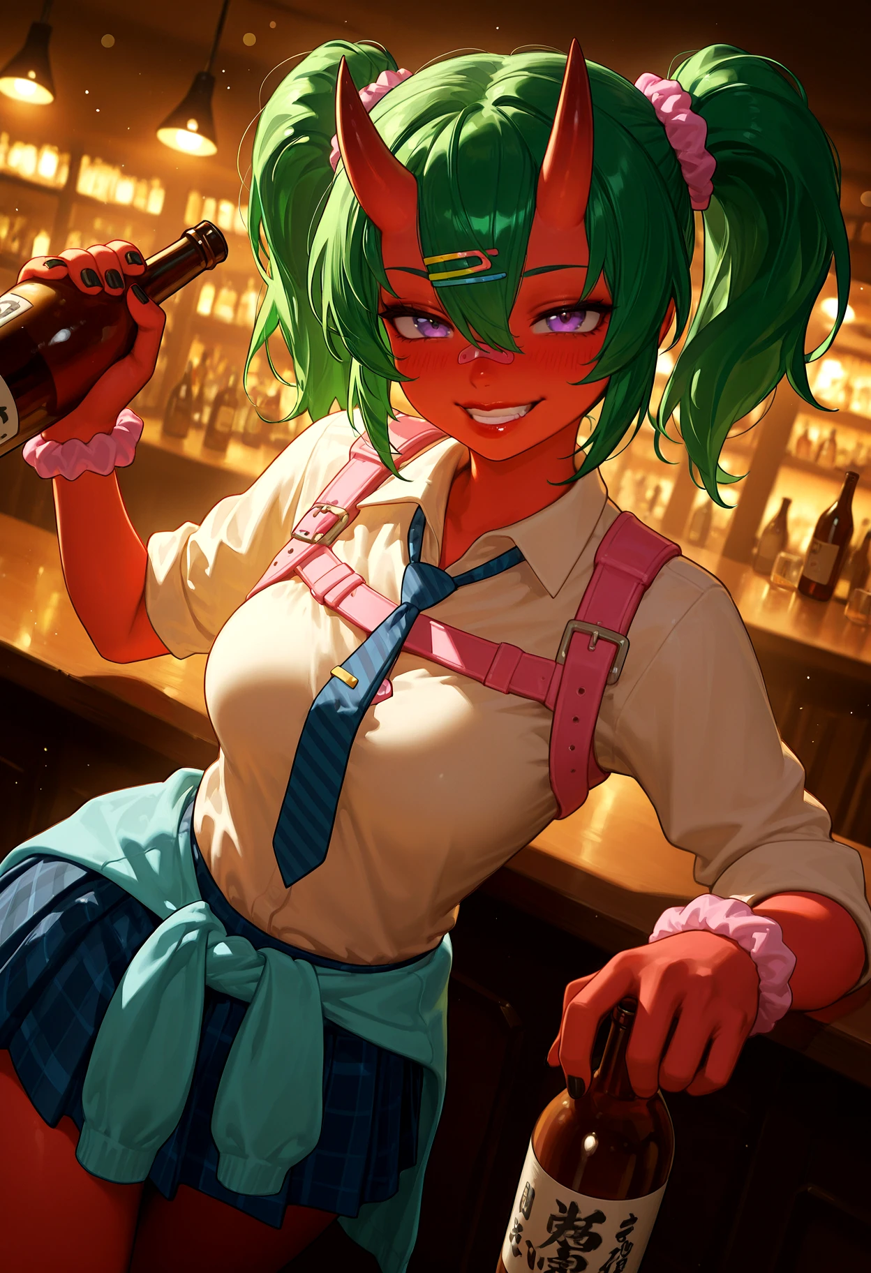 fn_nemia, 1girl, oni, red skin, purple eyes, bandaid on face, short hair, green hair, hairclip, pink scrunchie, twintails, bangs, hair between eyes, medium breasts, wide hips, (thick thighs:1.2),