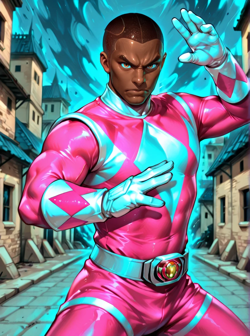 zack, pink power ranger, pink bodysuit, white gloves, 1boy dark-skinned, buzzcut