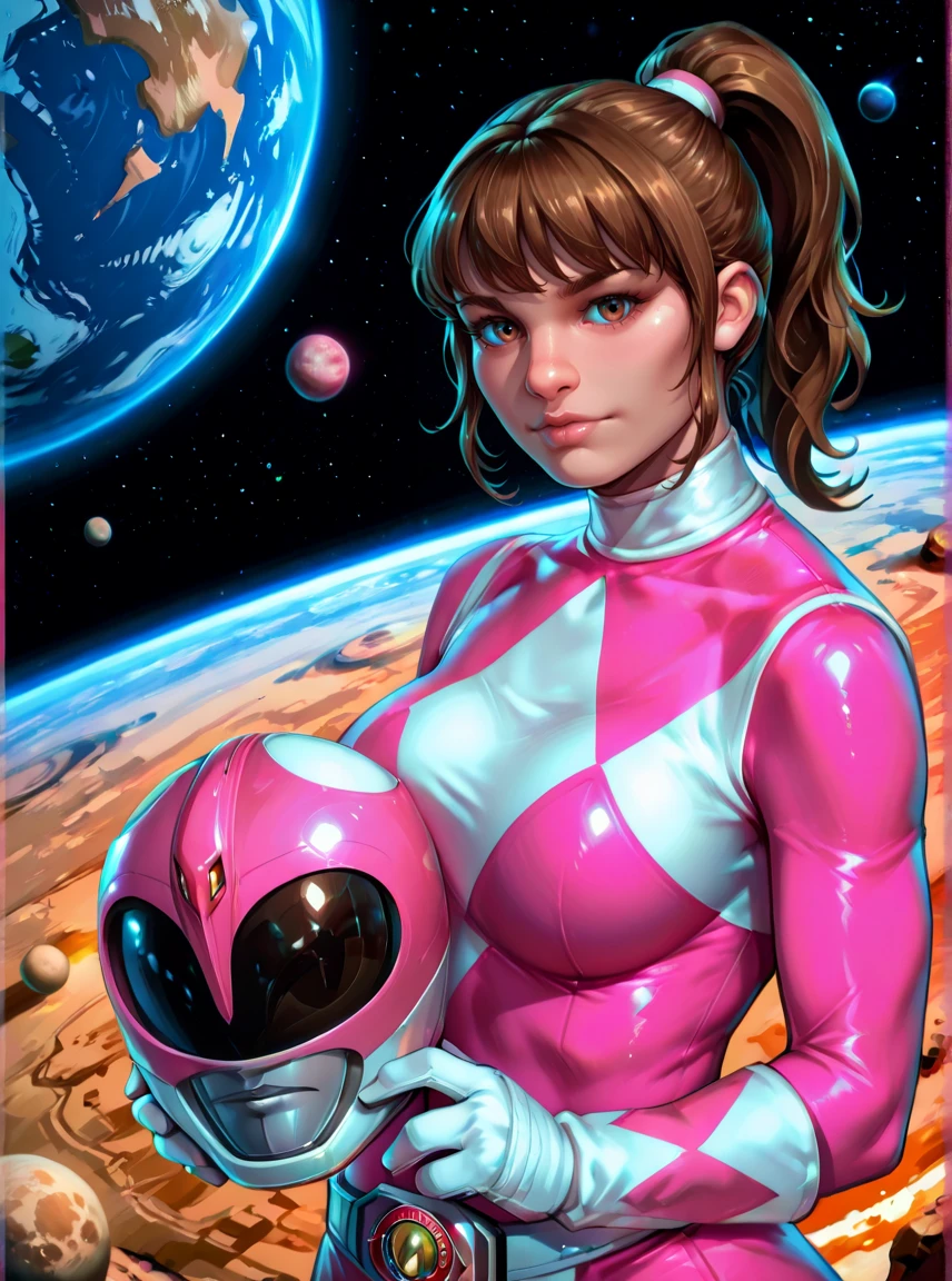 pink bodysuit, long brown hair, white gloves, pink power ranger, pink ranger helmet, 1girl, solo, medium breasts, mighty morphin power rangers,
