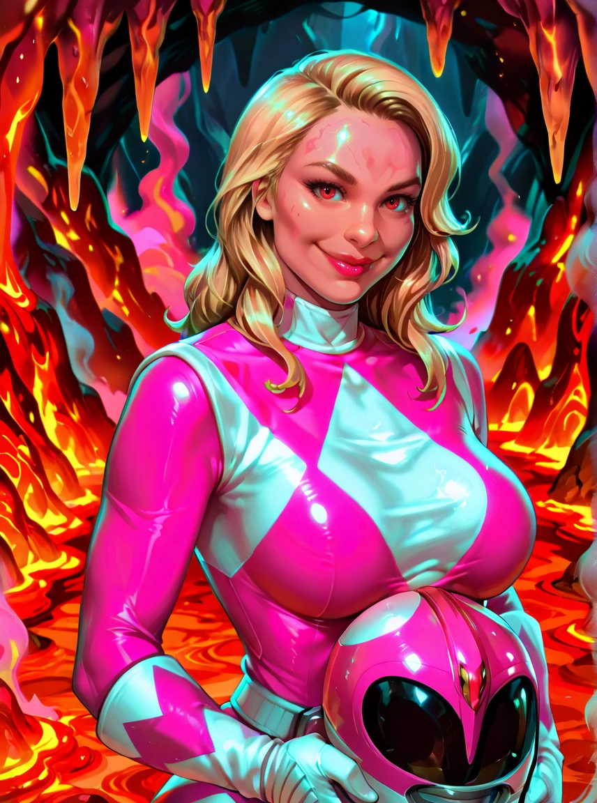 kate, pink power ranger,pink ranger helmet,pink bodysuit,white gloves,helmet removed,1girl, long blonde hair, breasts, blue eyes, lipstick,