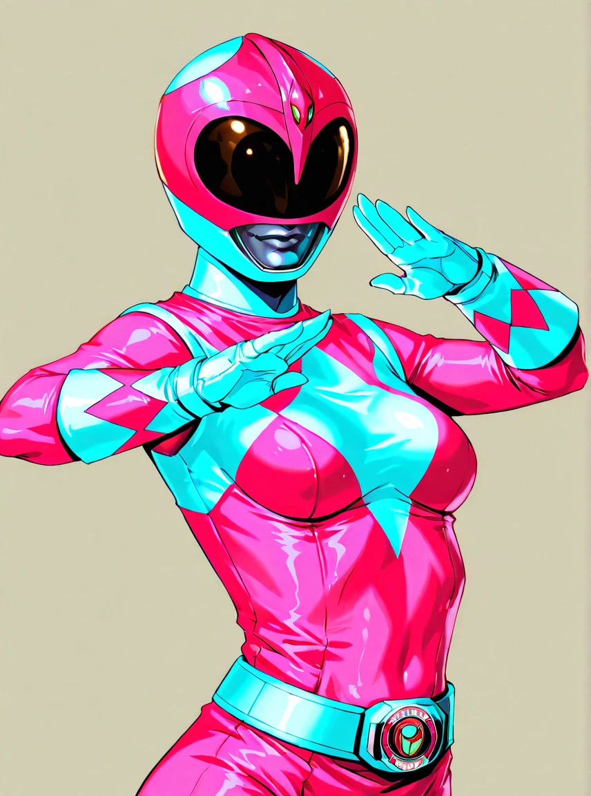 pink bodysuit, white gloves, pink power ranger, pink ranger helmet, 1girl, solo, medium breasts, tokusatsu, mighty morphin power rangers,