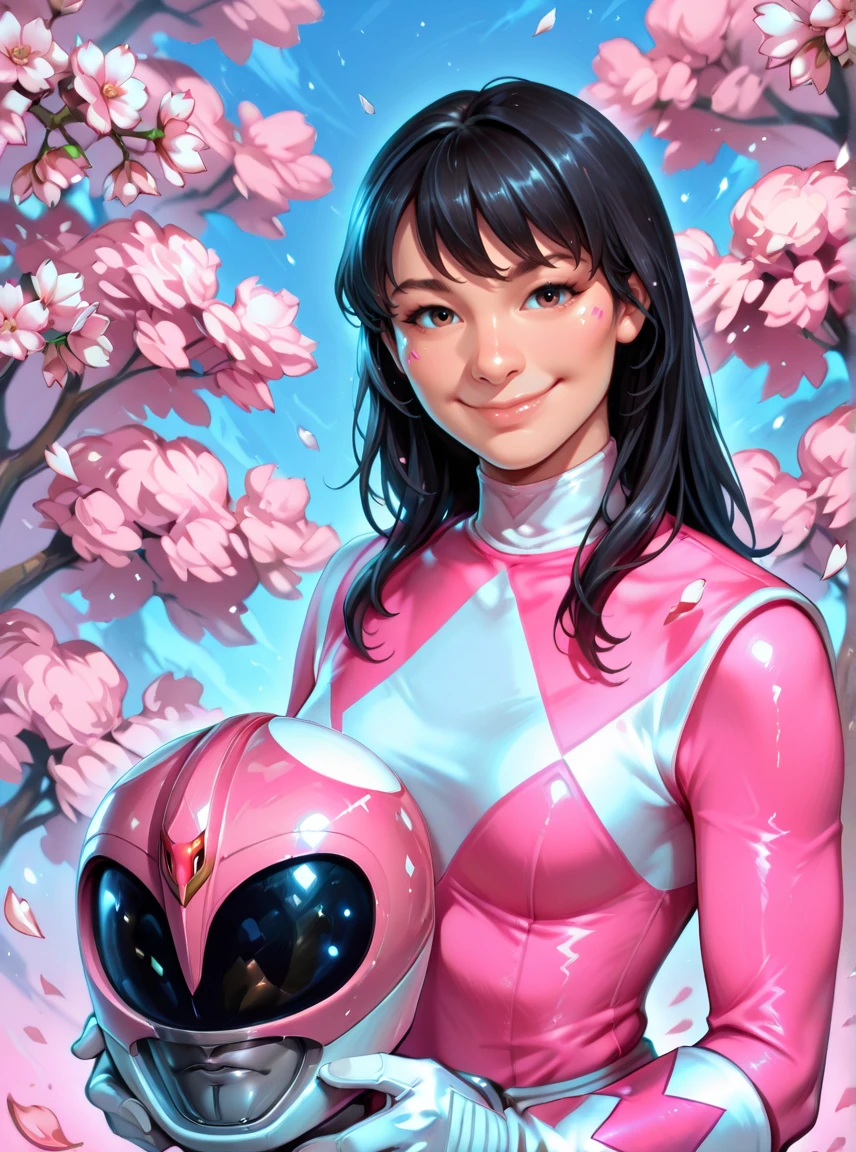 mei, pink power ranger,pink ranger helmet,pink bodysuit,white gloves,helmet removed,1girl, Asian girl, long black hair,