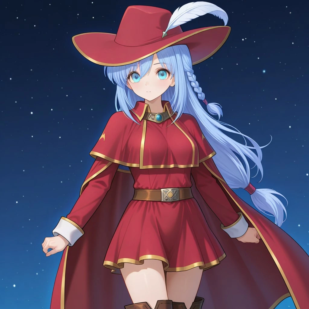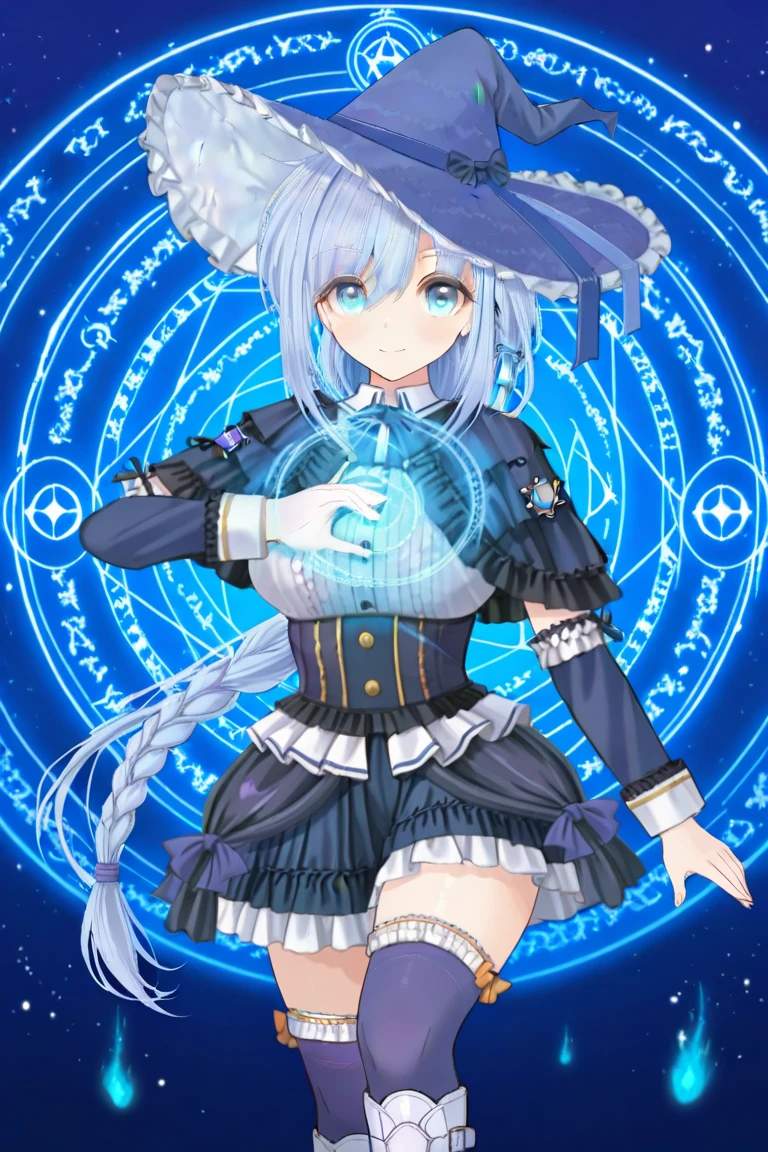 水色のロングヘアと編み込み、大きな魔女帽子、青を基調とした魔導士衣装を??して出力します。知的であどけない少女らしい雰囲気を保ちながら、セクシーな構図や露出多めの描写にも対応できます。