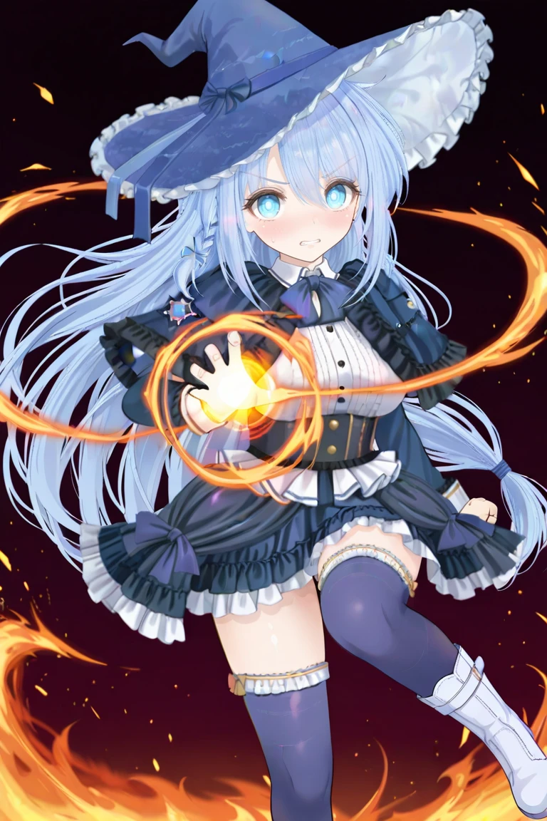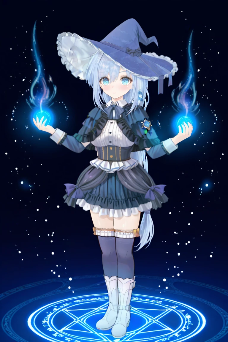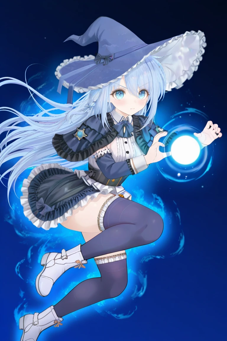 blue headwear,hat,witch hat,frills,shirt,capelet,skirt,long sleeves,blue thighhighs,thighhighs,white footwear,boots,Description