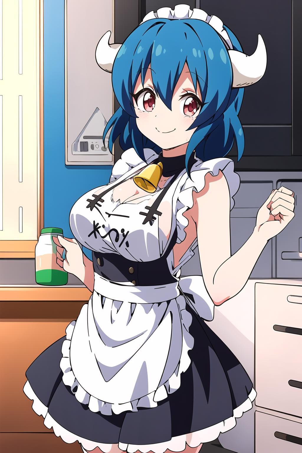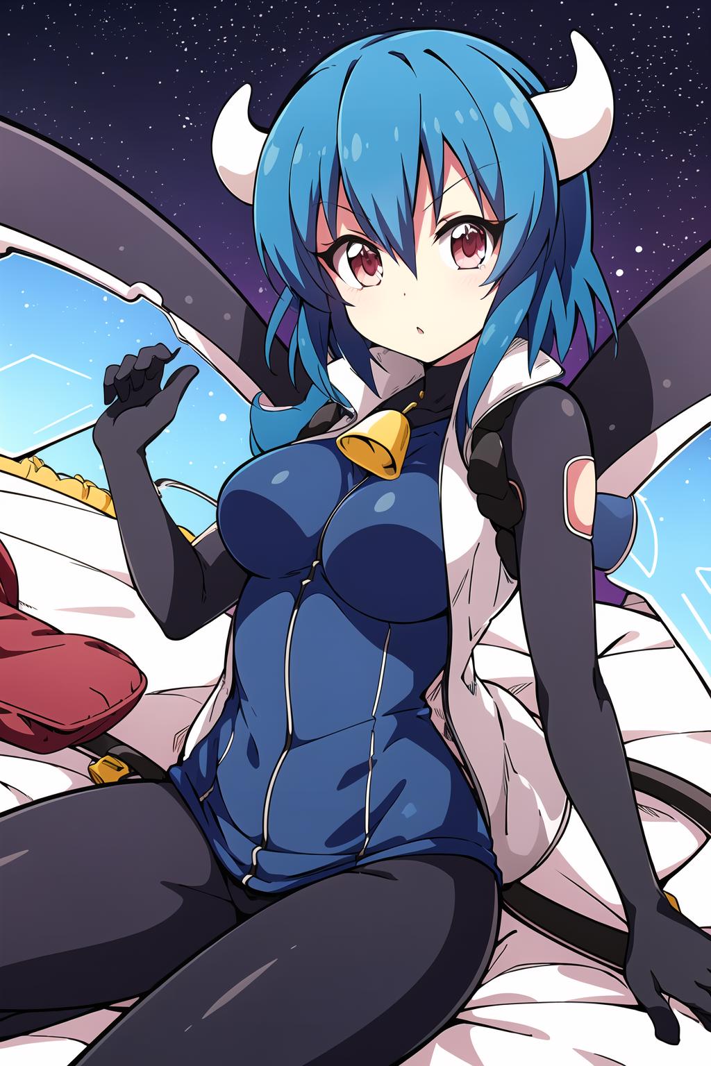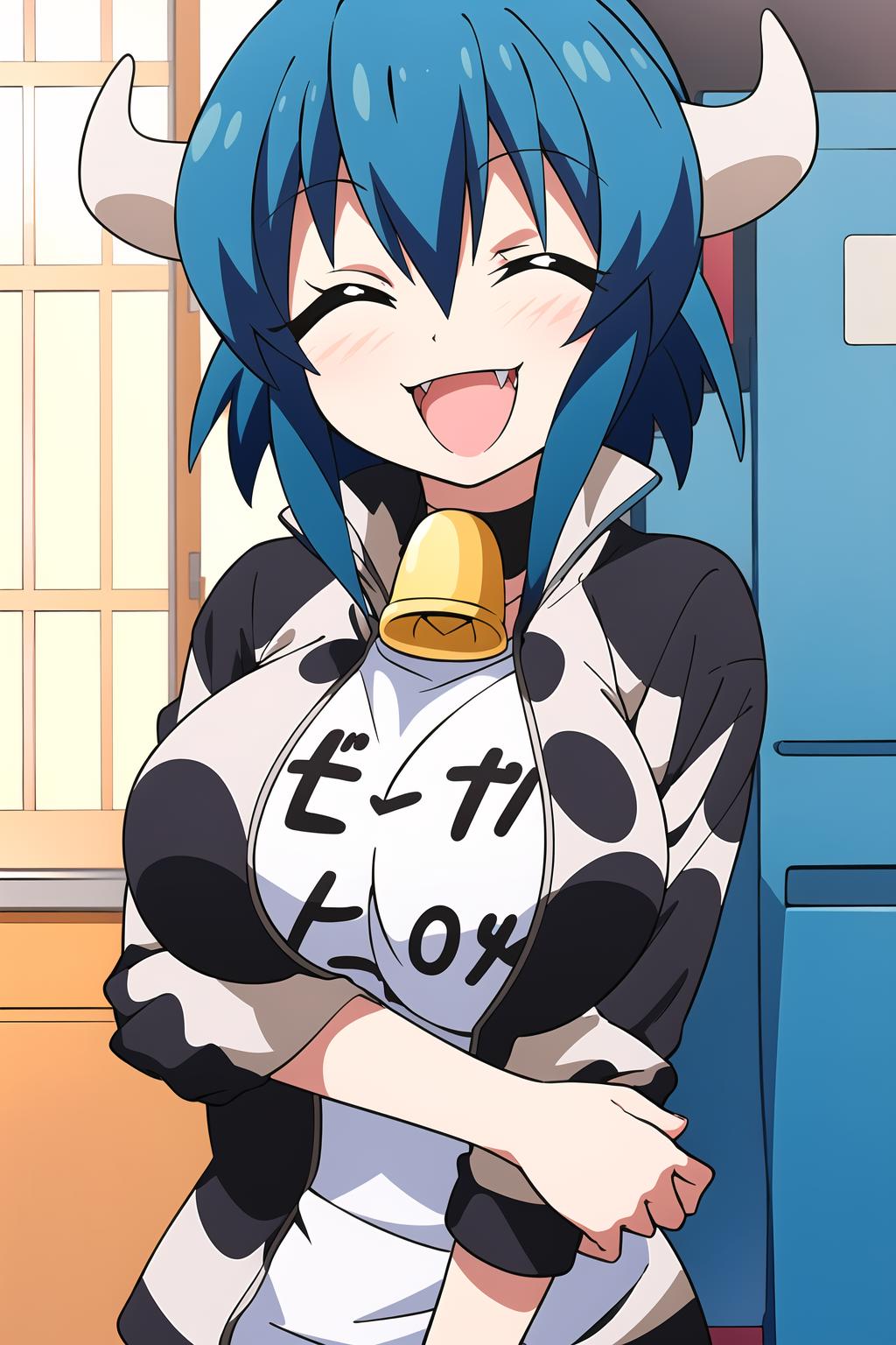 horns, blue hair, cowbell, cow print