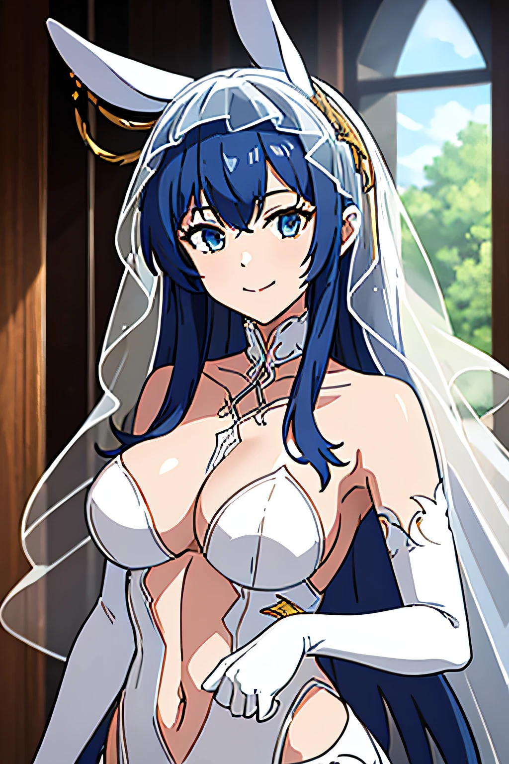 CCNJ, LONG HAIR, FAKE ANIMAL EARS, BRIDE, BRIDAL VEIL, LARGE BREASTS, BARE SHOULDERS, WEDDING DRESS, NAVEL CUTOUT, ELBOW GLOVES, WHITE GLOVES, SIDEBOOB