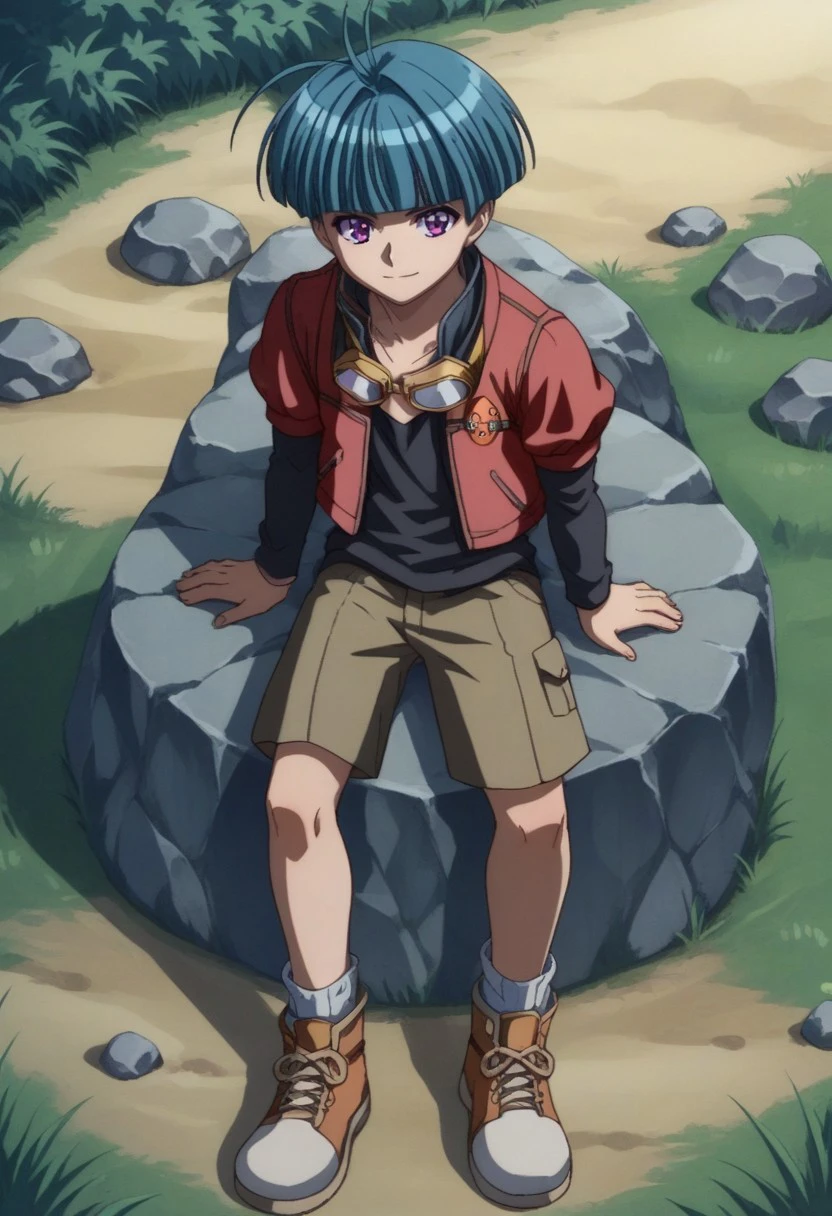 elliott, solo, male focus, goggles, 1boy, shorts, ahoge, goggles around neck, blue hair, blunt bangs, purple eyes, jacket, long sleeves, shoes, red jacket, black shirt, ankle boots,