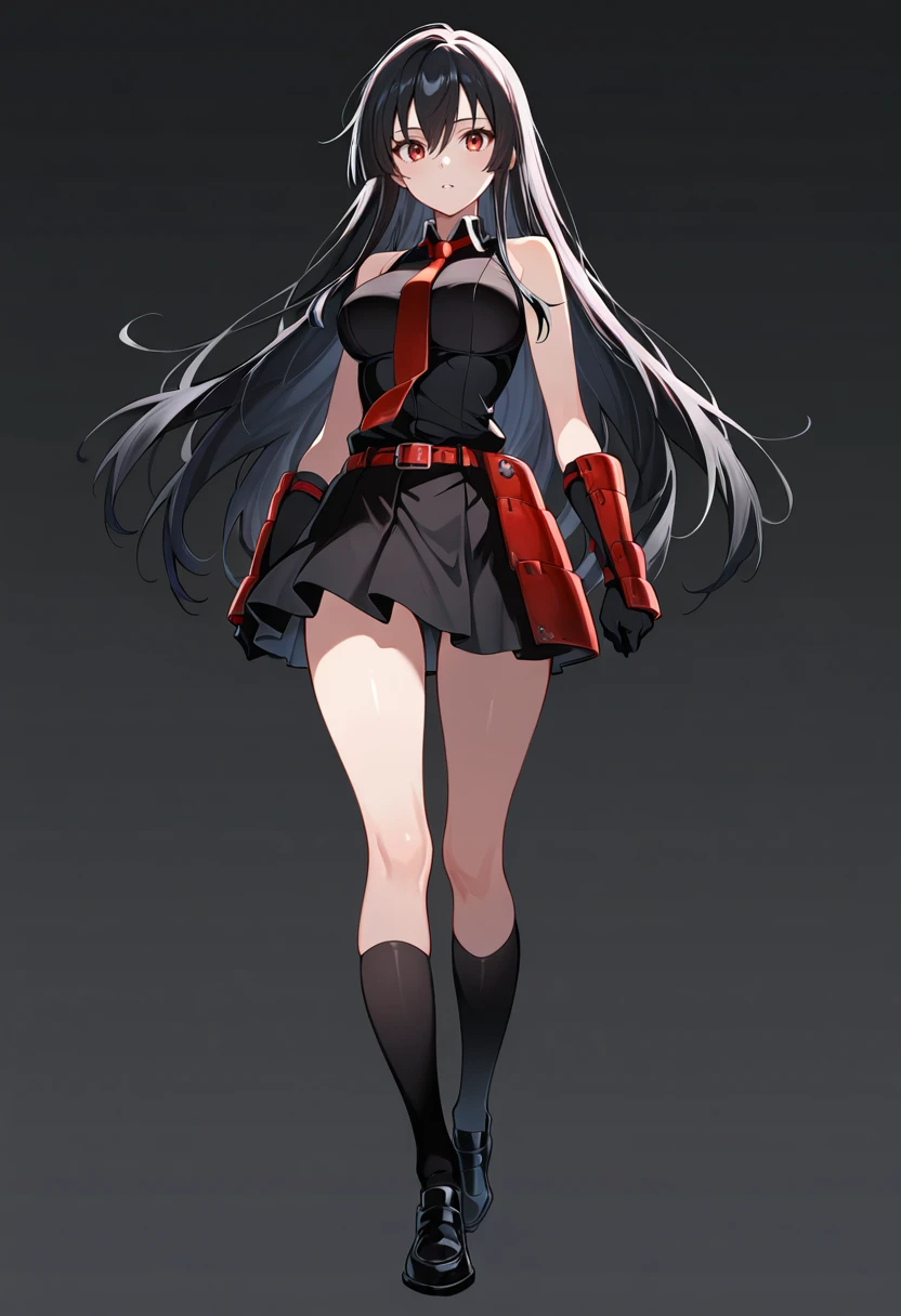 black shirt, red necktie, black skirt, black gloves, red belt, black knee highs, black footwear, armor, bare shoulders,