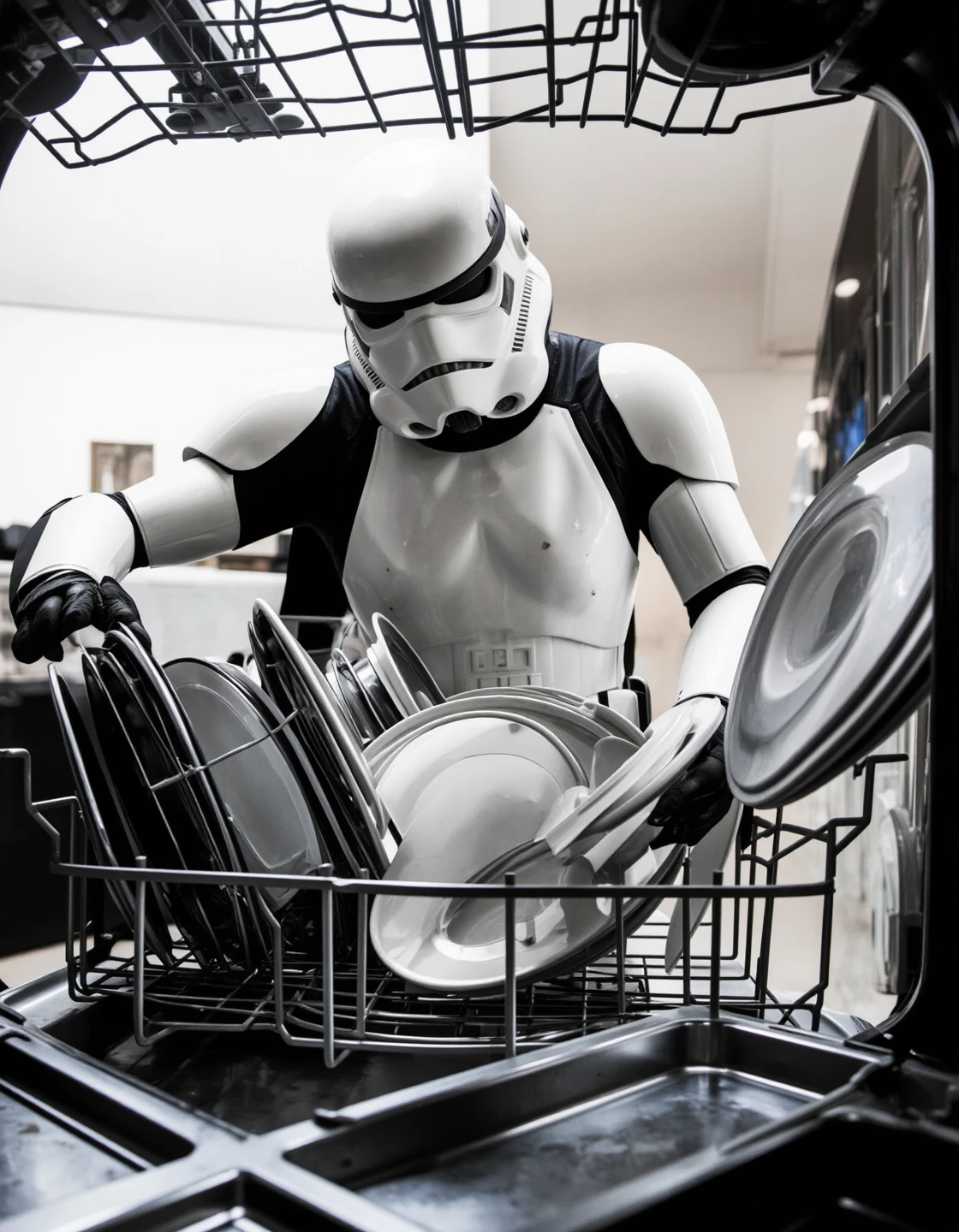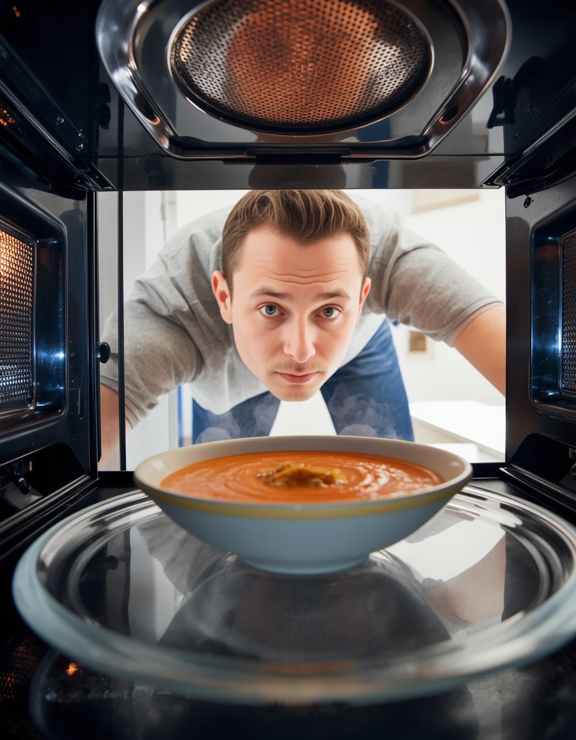 This model is intended to produce a reverse point-of-view (POV) style, where the perspective is from inside a common household appliance—such as a refrigerator, oven, microwave, washing machine, or dishwasher—looking outward toward a human or character interacting with the appliance. The scenes are composed with high attention to realism, lighting, and immersion, often including elements like steam, condensation, reflections, appliance textures, or glow from internal lights to reinforce authenticity. The prompt structure begins with “A reverse POV image, featuring a [appliance]”, followed by a detailed description of what is seen from that inside-the-appliance angle. This includes the human or character’s appearance, expression, posture, and action, as well as the setting, atmosphere, and visual elements like food, laundry, or dishes in the foreground. Emotional tone or implied narrative is often conveyed subtly through body language or item choice. To effectively prompt in this style, maintain a grounded and naturalistic tone—even for surreal or humorous characters—and focus on what the appliance “sees,” keeping the viewer immersed in that unique perspective.