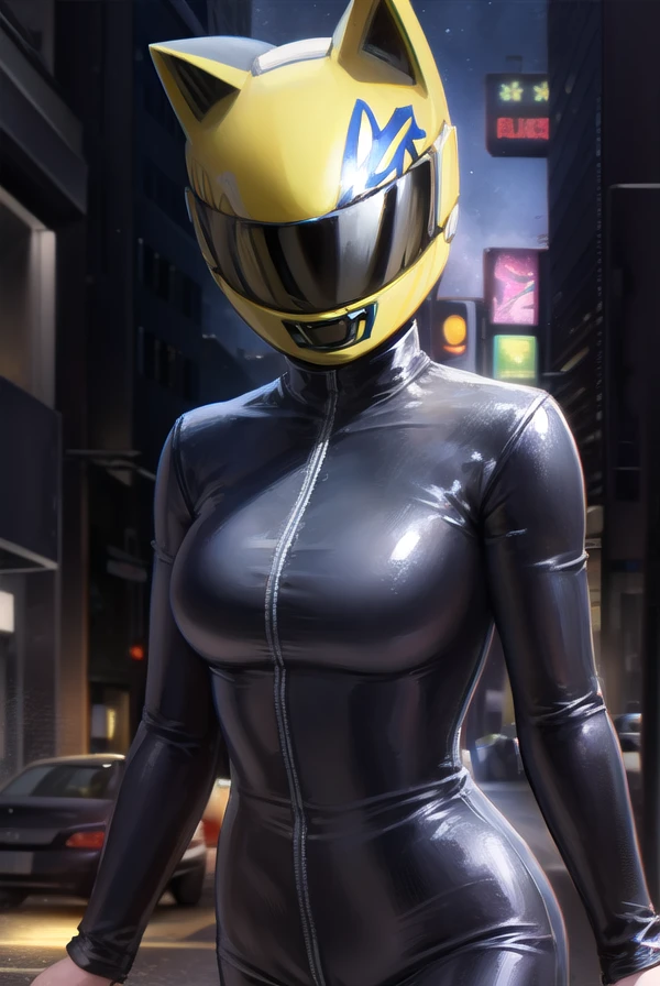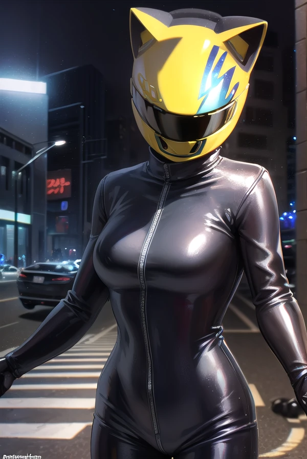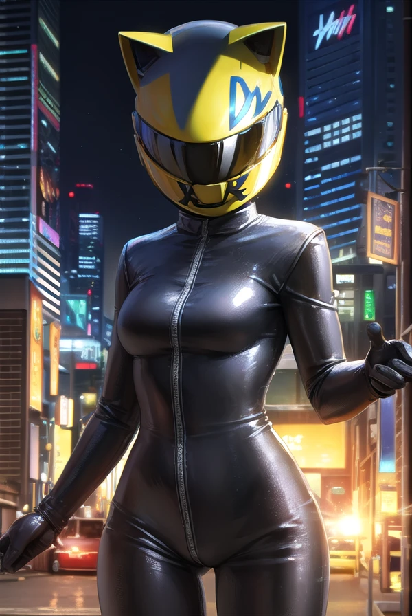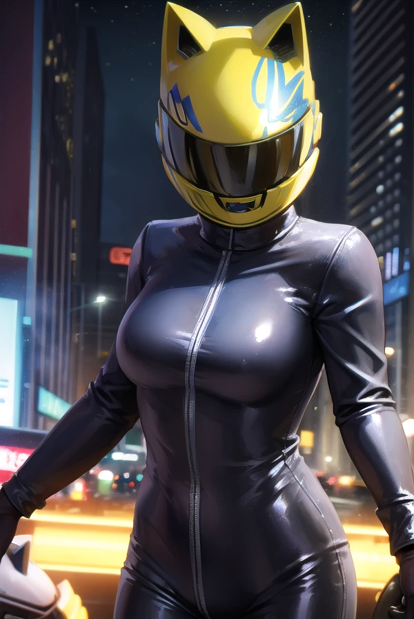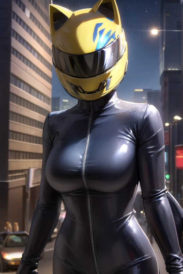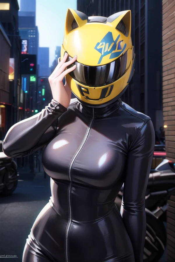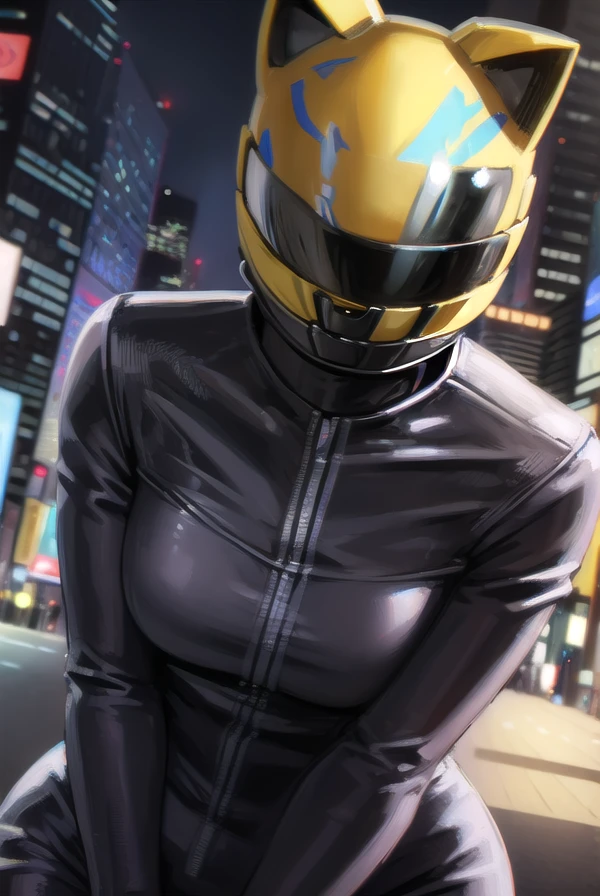 celty sturluson, animal ears, cat ears, bodysuit, helmet, ground vehicle, skin tight, motor vehicle, black bodysuit, motorcycle, (motorcycle helmet:1.5),