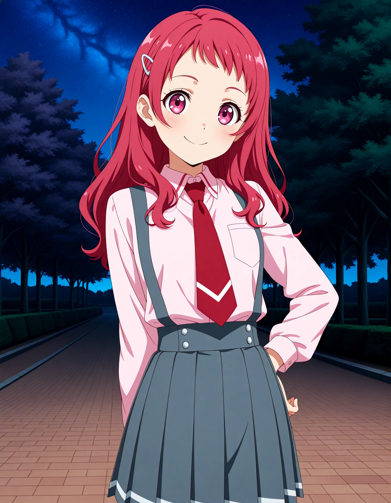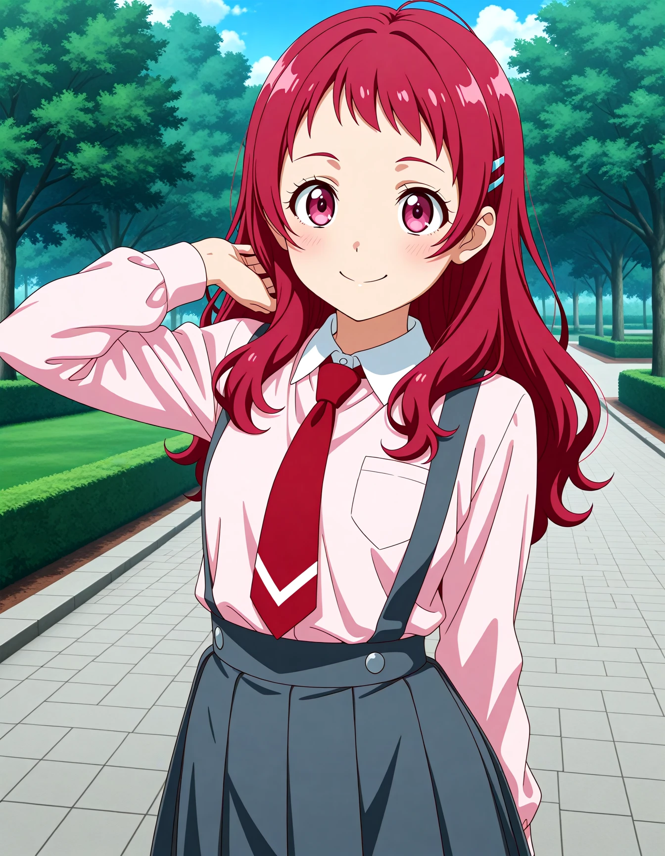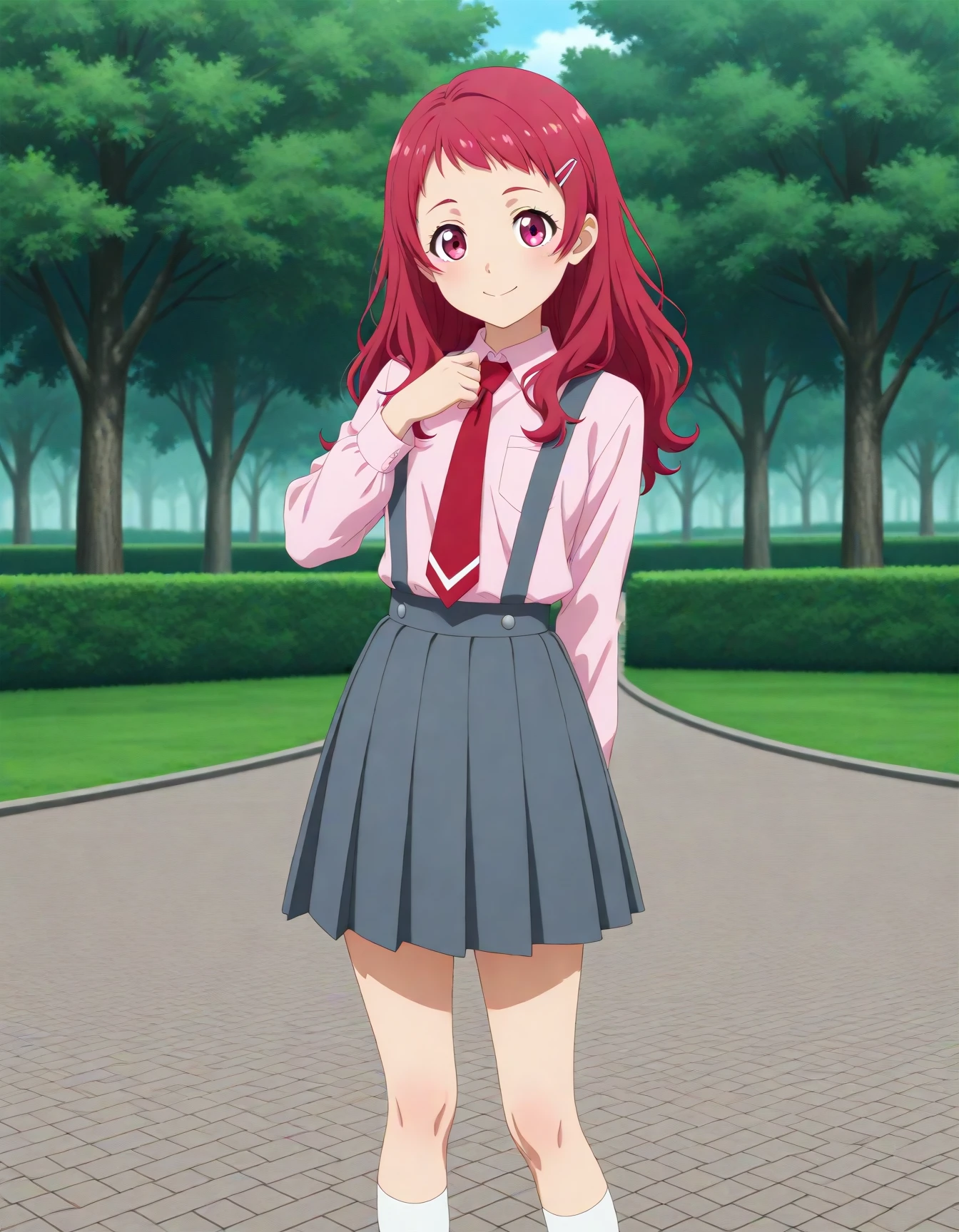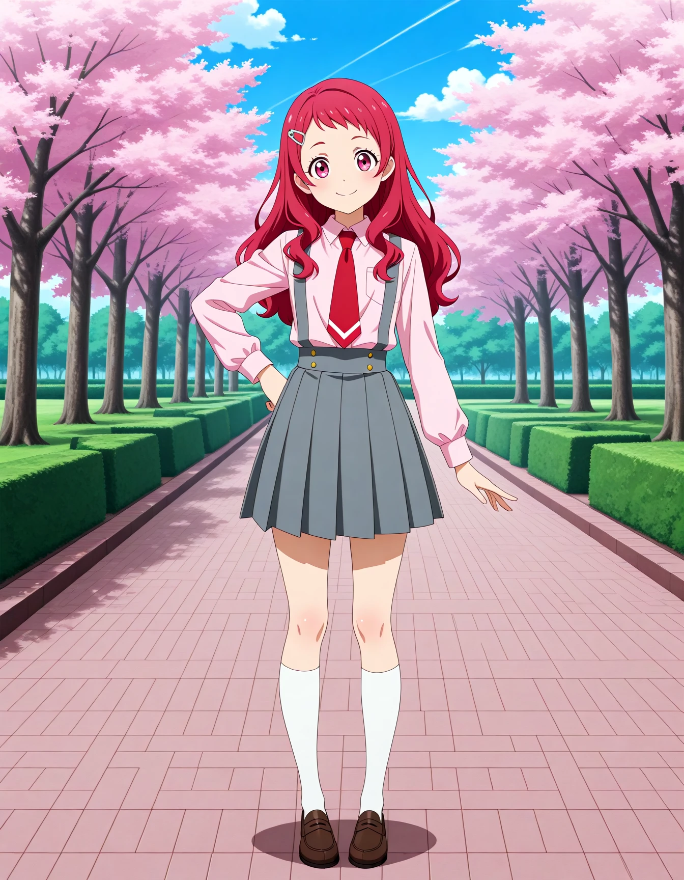 school uniform,red necktie,pink shirt,collared shirt,long sleeves,suspender skirt,grey skirt,pleated skirt,kneehighs,white socks,brown footwear,loafers,
