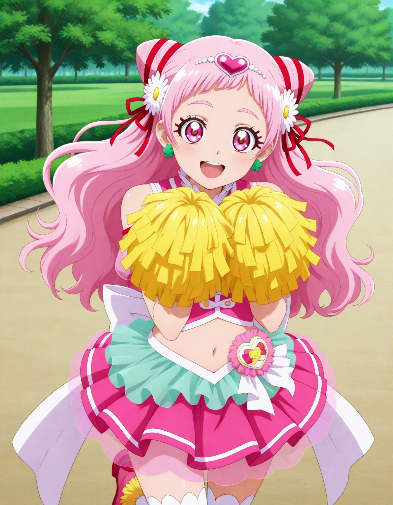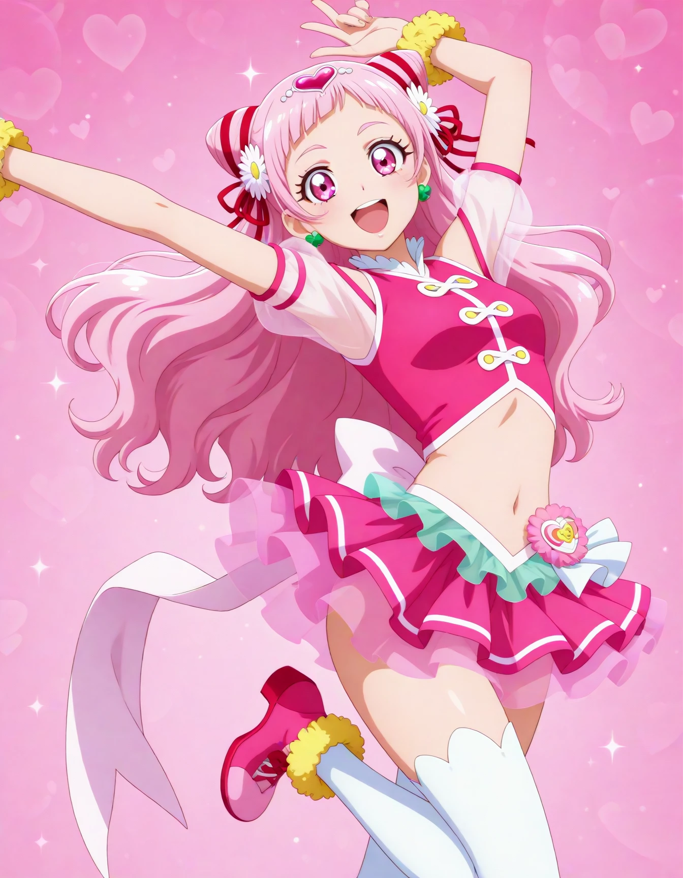 cure yell,solo,pink eyes,thick eyelashes,pink hair,long hair,hair bun,cone hair bun,hair ribbon,red ribbon,heart hair ornament,hair flower,double bun,short bangs,earrings,ribbon,
