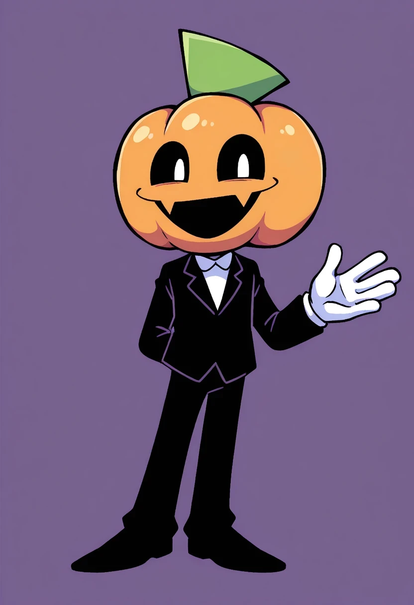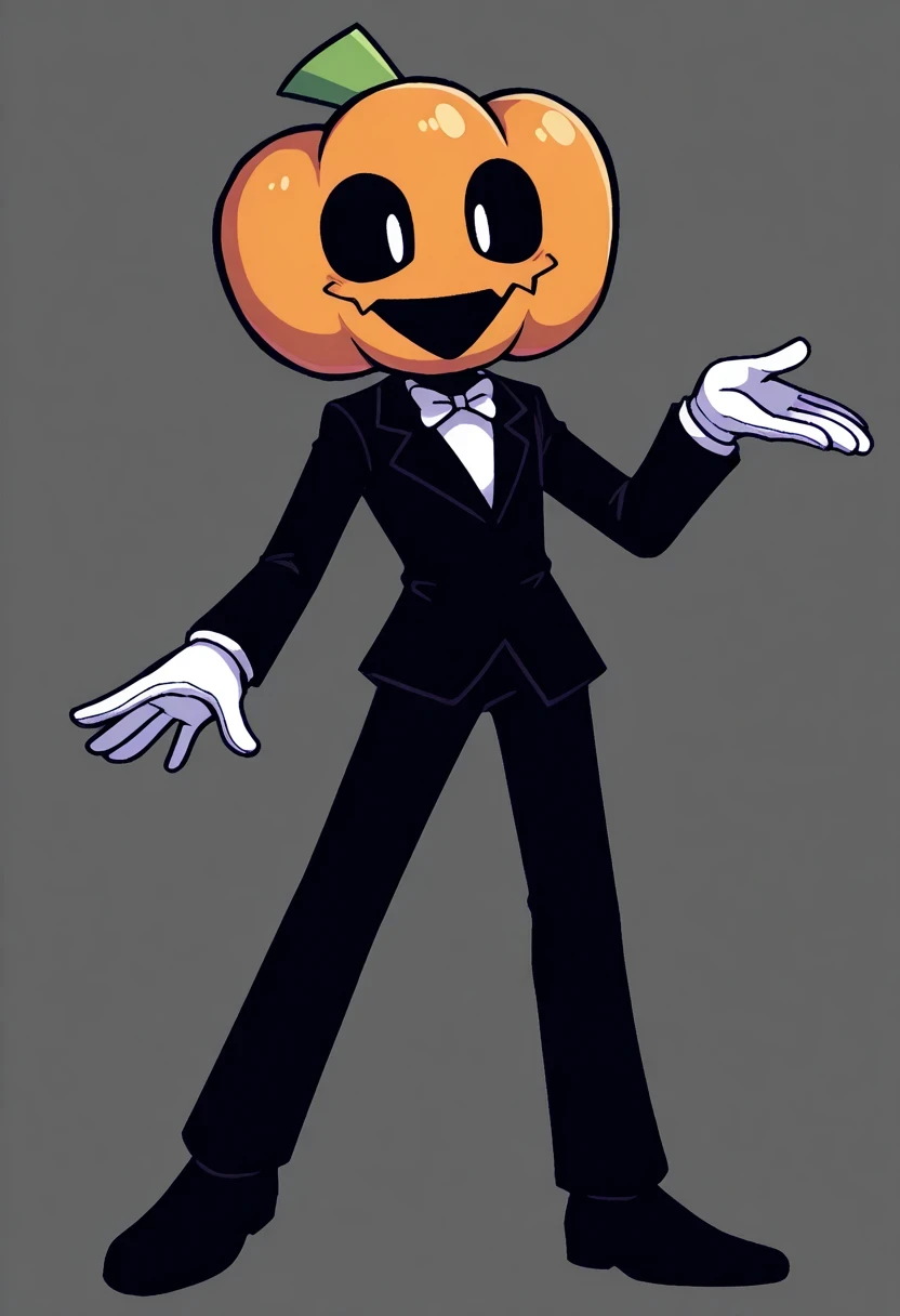 PumpFNF, 1boy, pumpkin costume, black suit with a white shirt underneath, white gloves, pumpkin head mask, white eyes, black sclera, colored sclera, short,