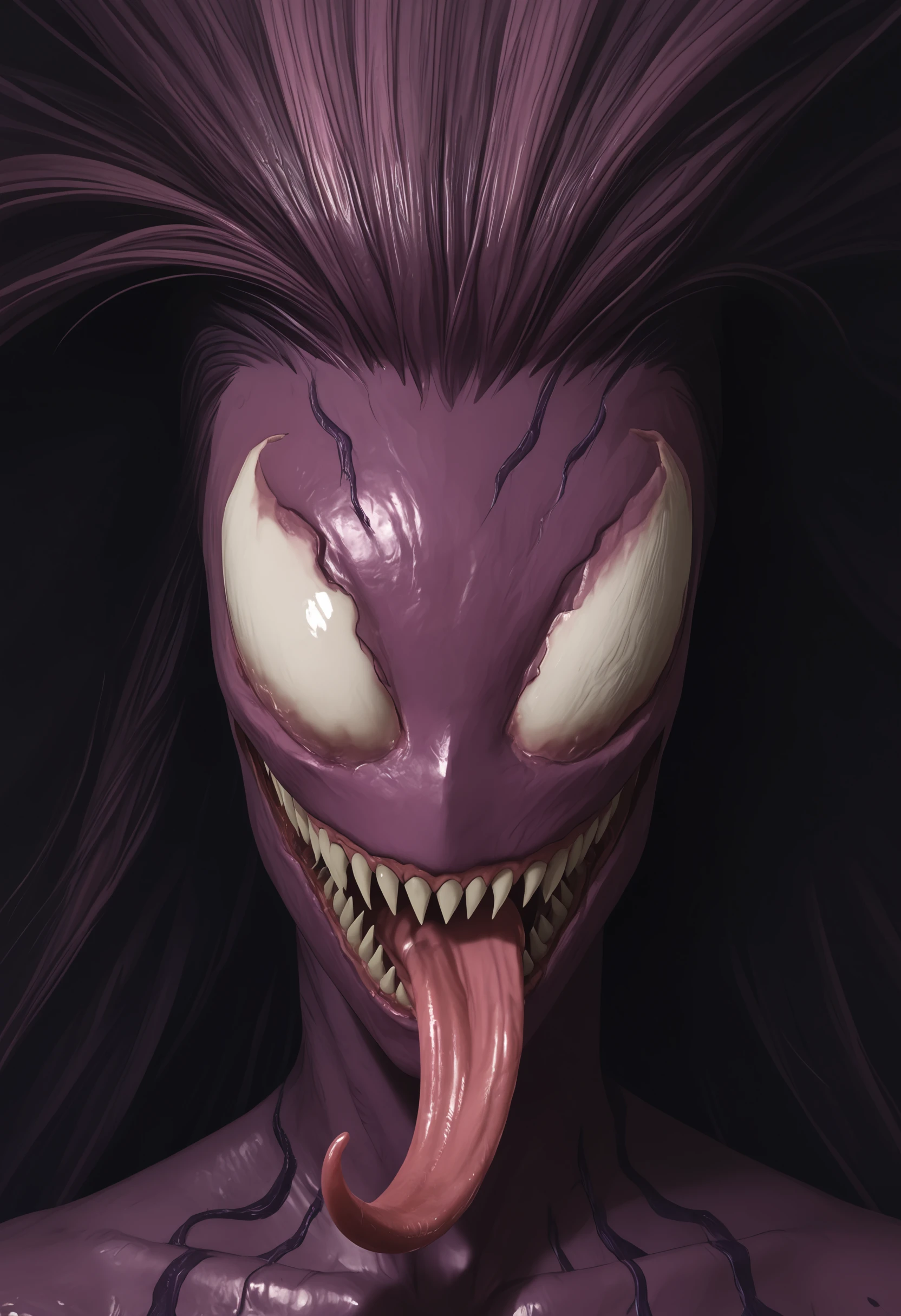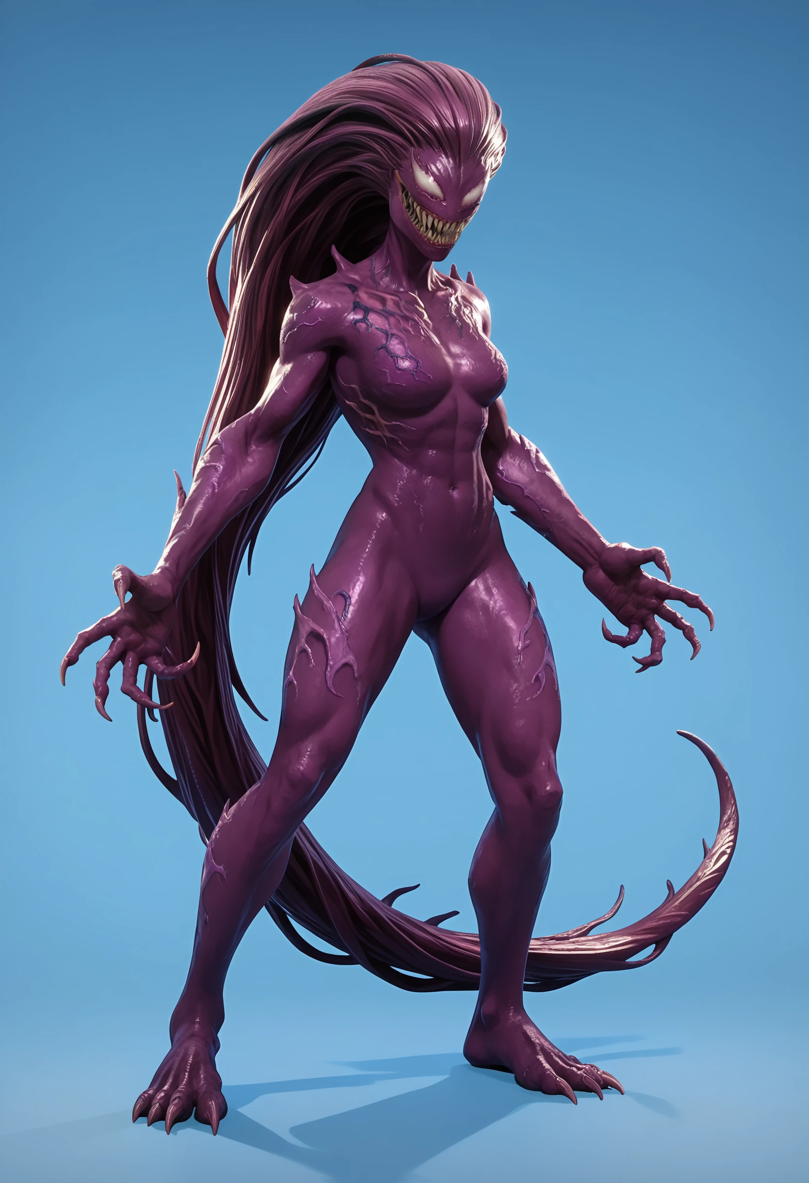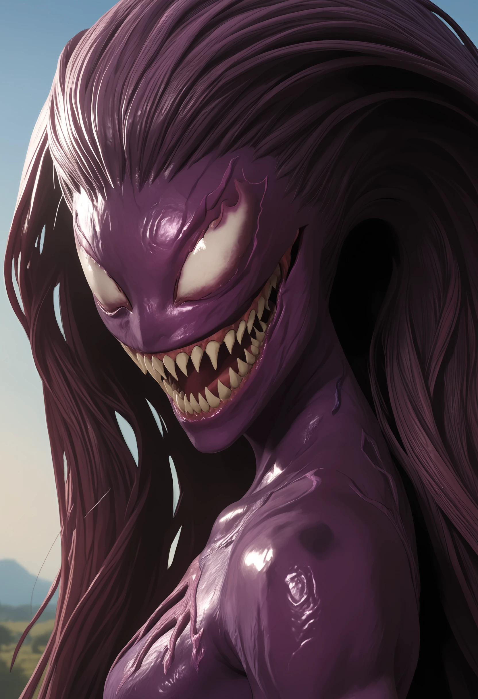 1girl agonyf, colored skin, purple skin, teeth, sharp teeth, breasts, white eyes, monster, very long hair, claws