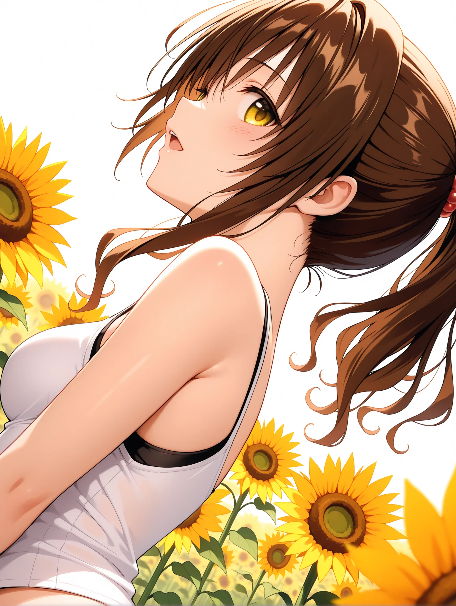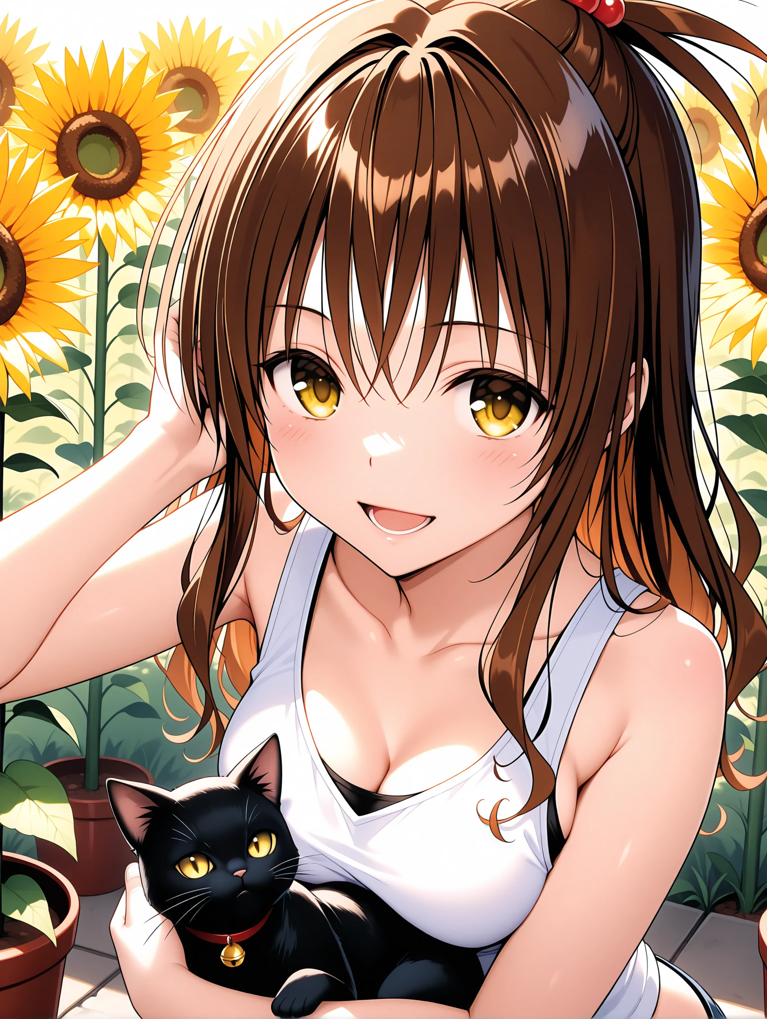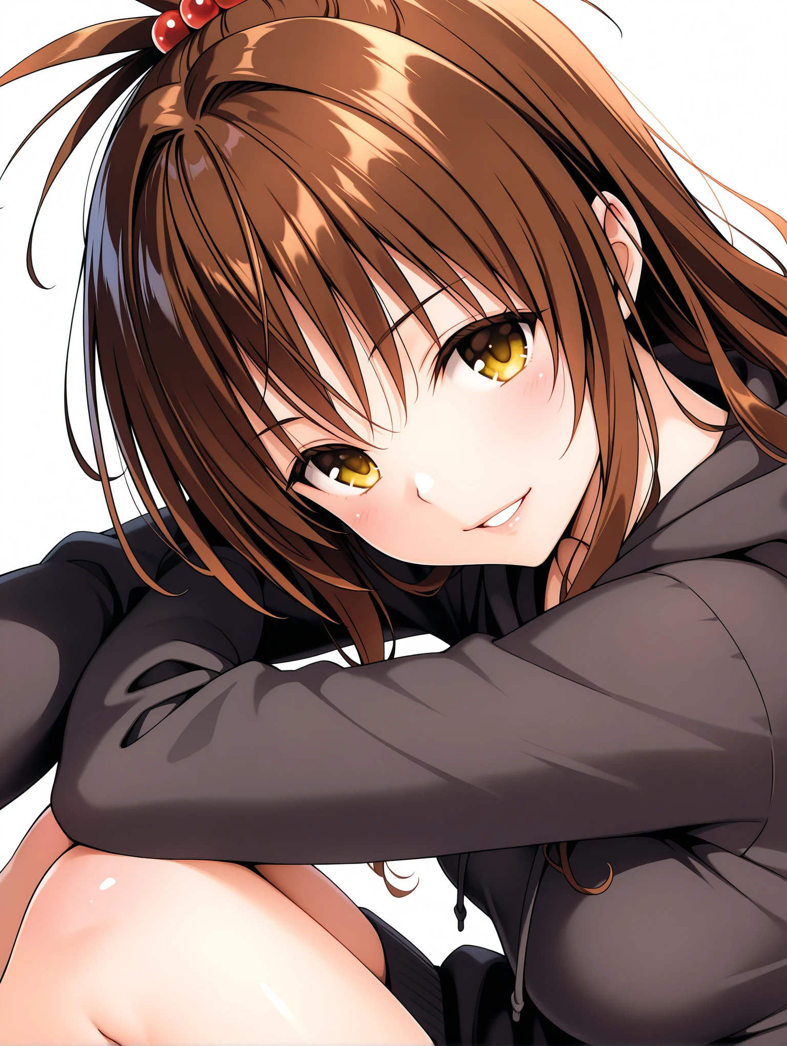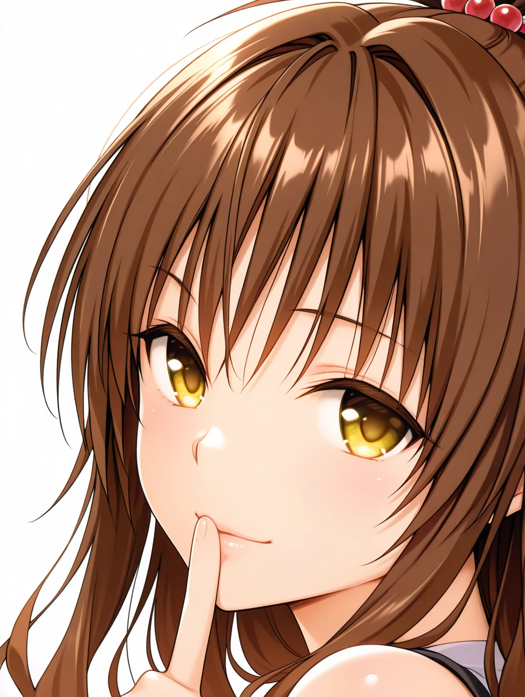 トリガーワード・y_mikan,topknot,brown hair,long hair,yellow eyes,hair ornament,hair bobbles,