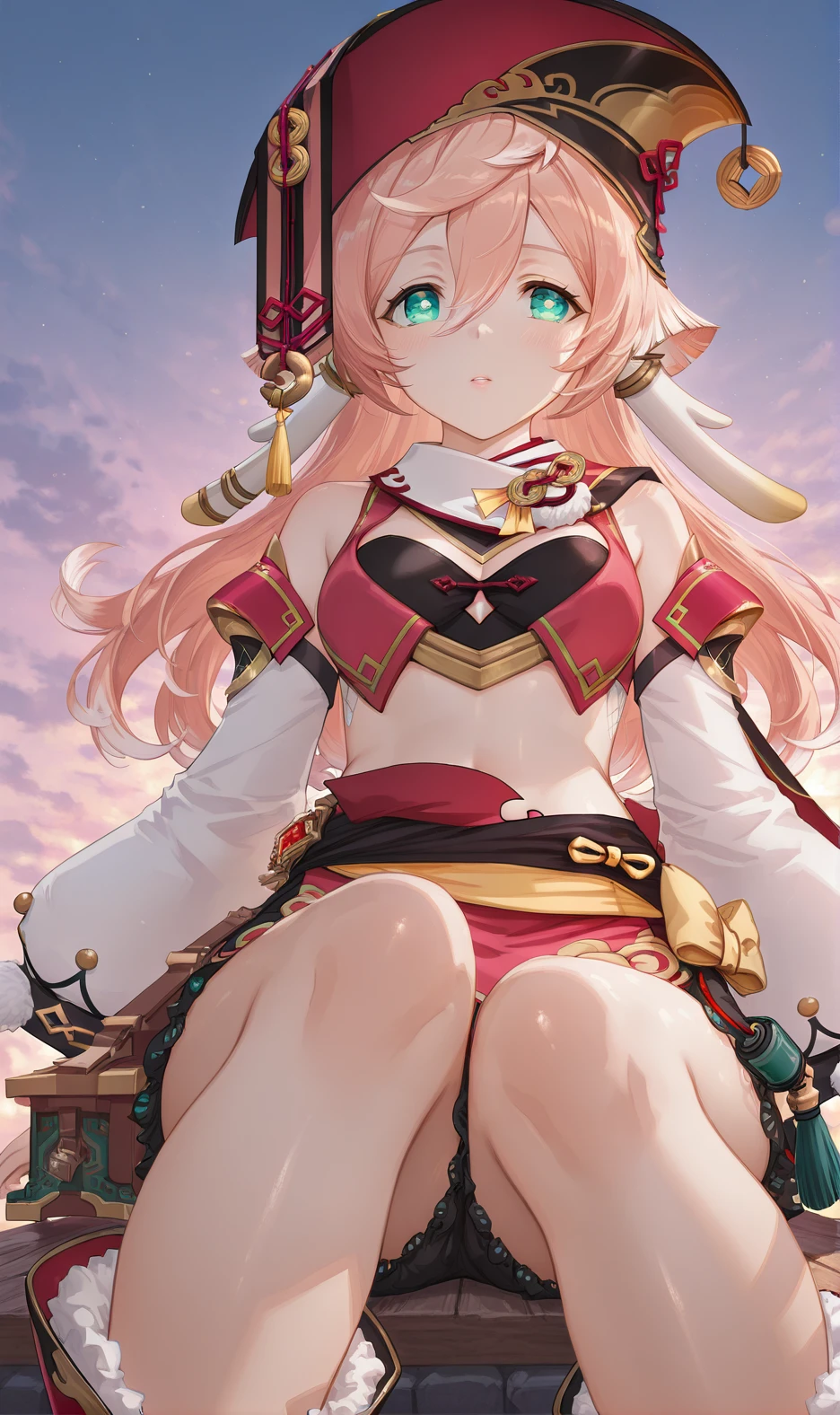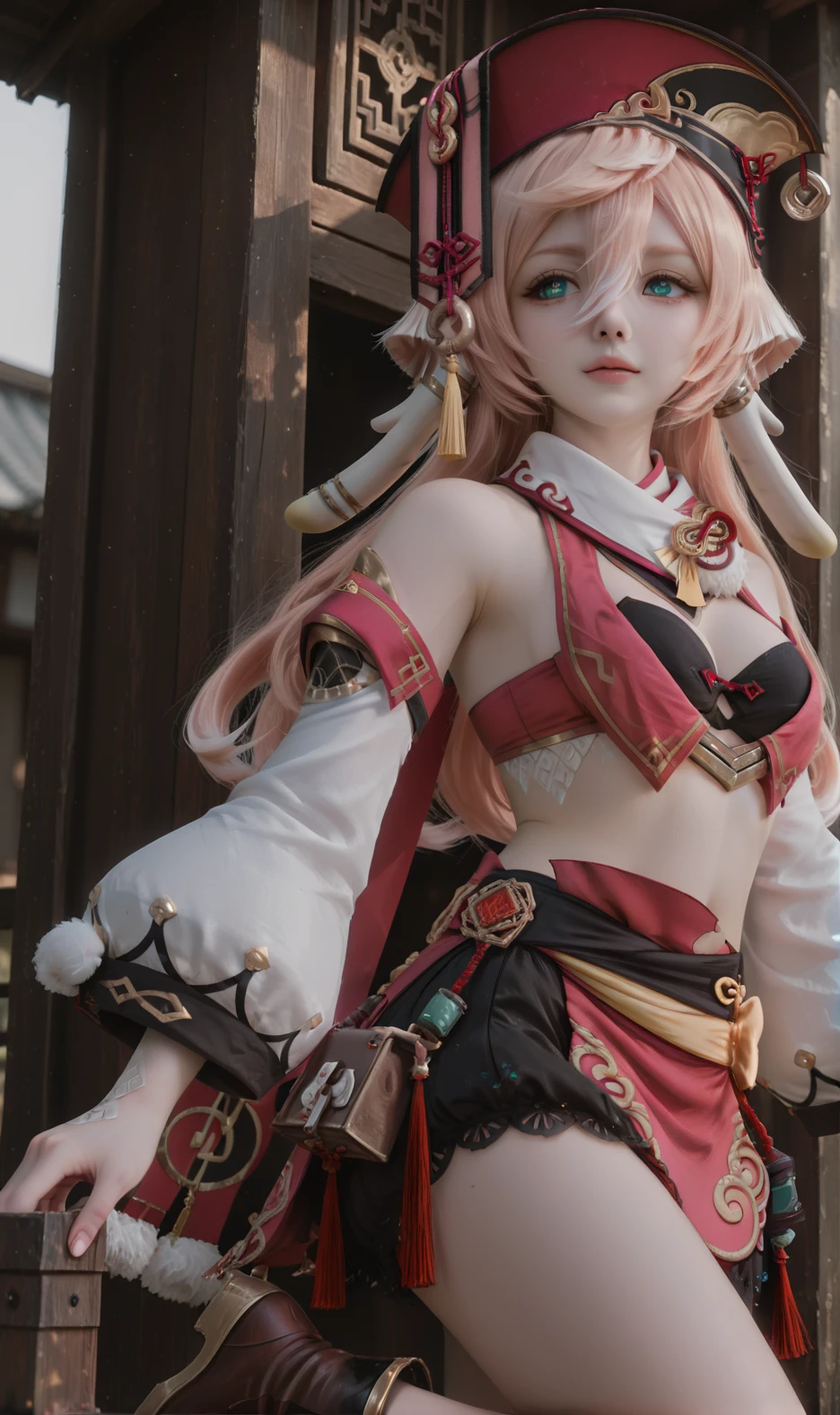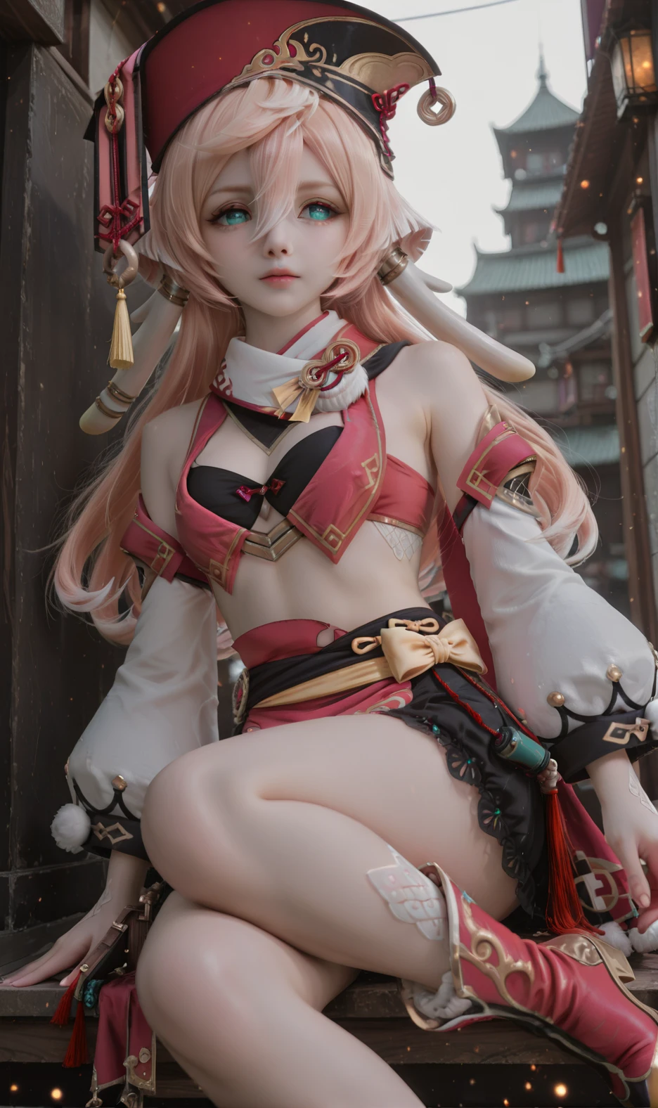 Yanfei,yanfei \(genshin impact\),1girl,pink hair,solo,detached sleeves,red headwear,midriff,crop top,long hair,green eyes,hair between eyes,long sleeves,boots,horns,antlers,bare shoulders,pom pom \(clothes\),hat,bare legs,bloomers,skirt,aqua eyes,black bra,scales,underwear,