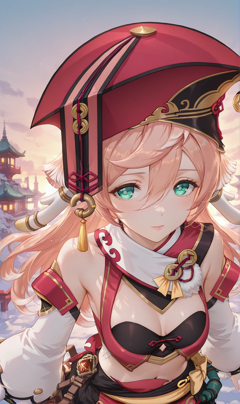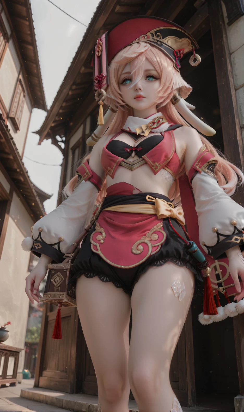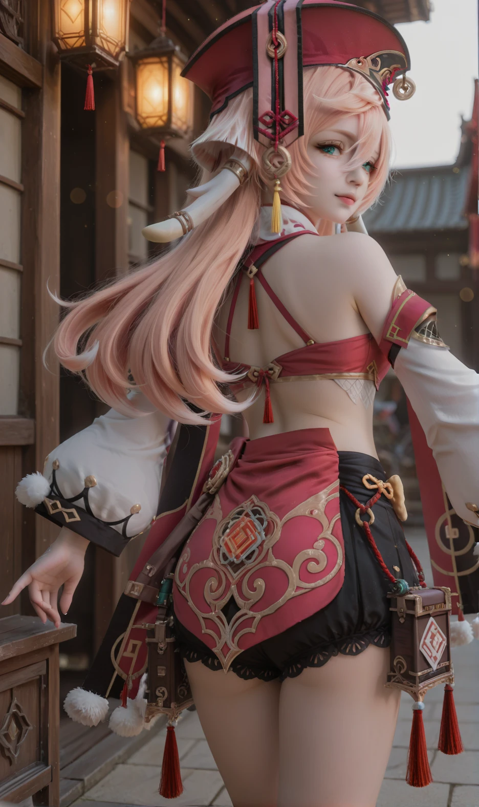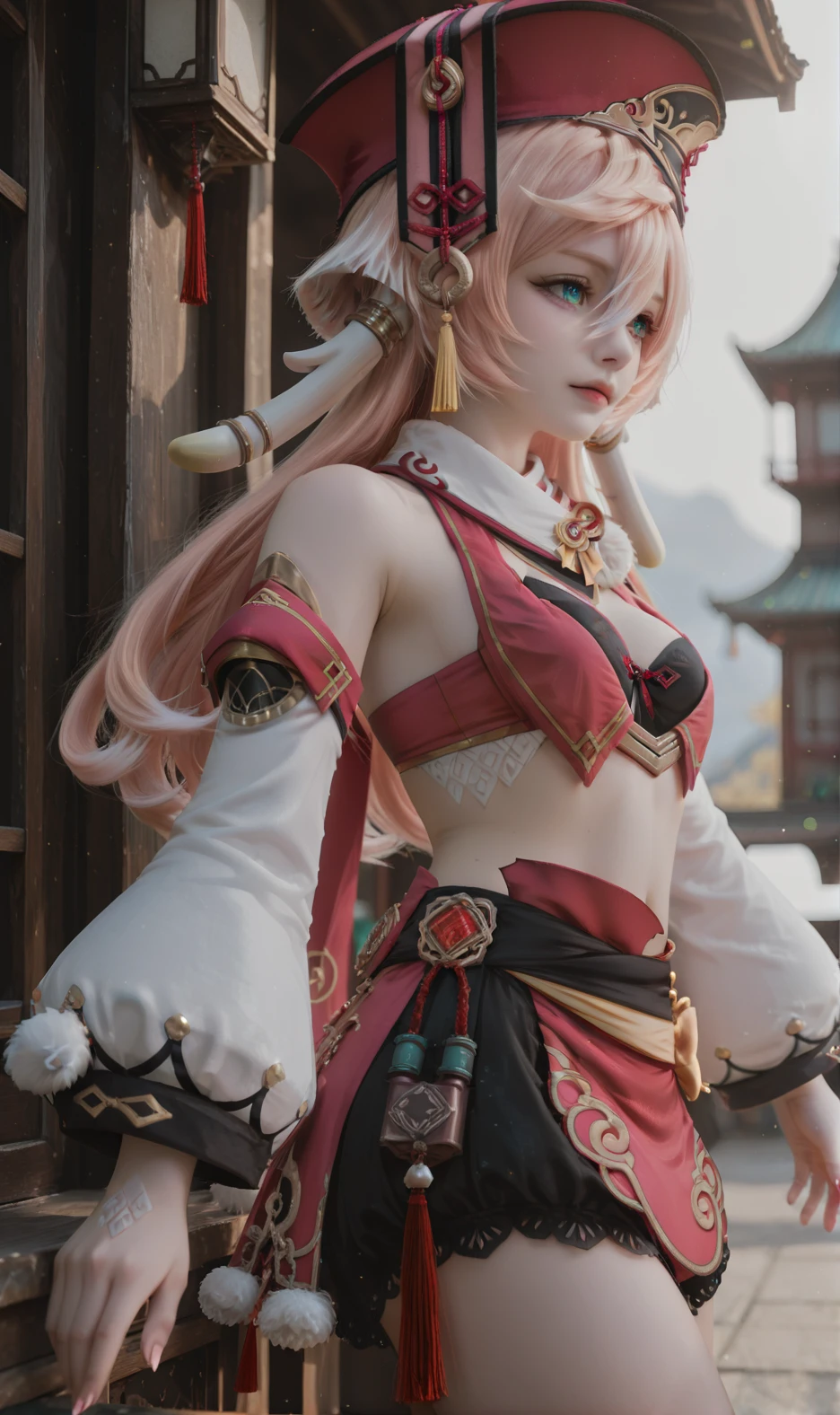 Yanfei,yanfei \(genshin impact\),1girl,pink hair,solo,detached sleeves,red headwear,midriff,crop top,long hair,green eyes,hair between eyes,long sleeves,boots,horns,antlers,bare shoulders,pom pom \(clothes\),hat,bare legs,bloomers,skirt,aqua eyes,black bra,scales,underwear,