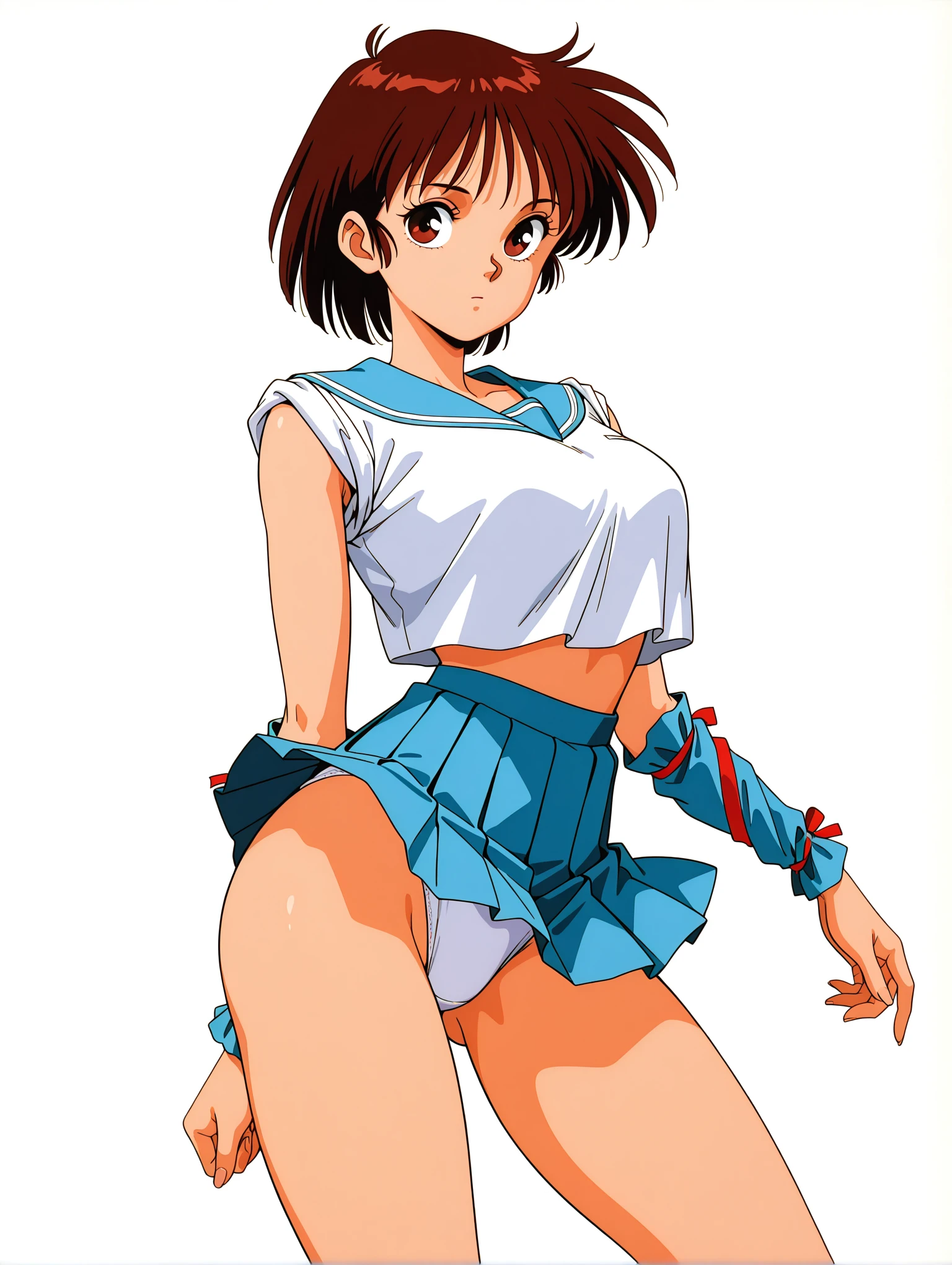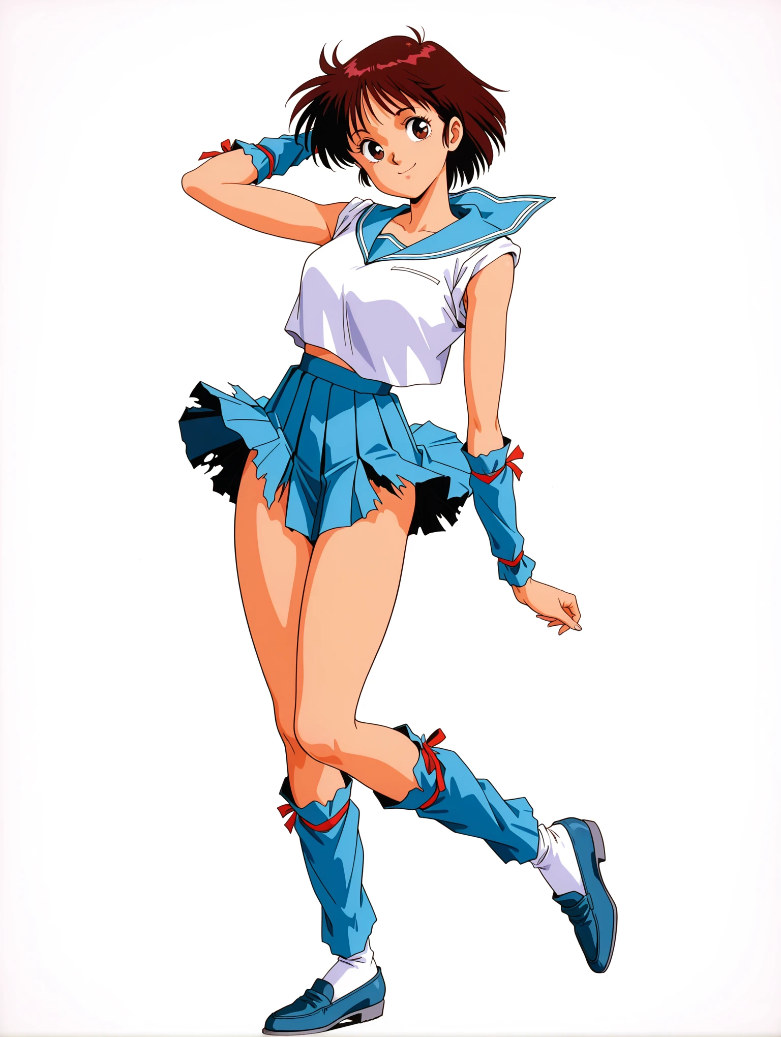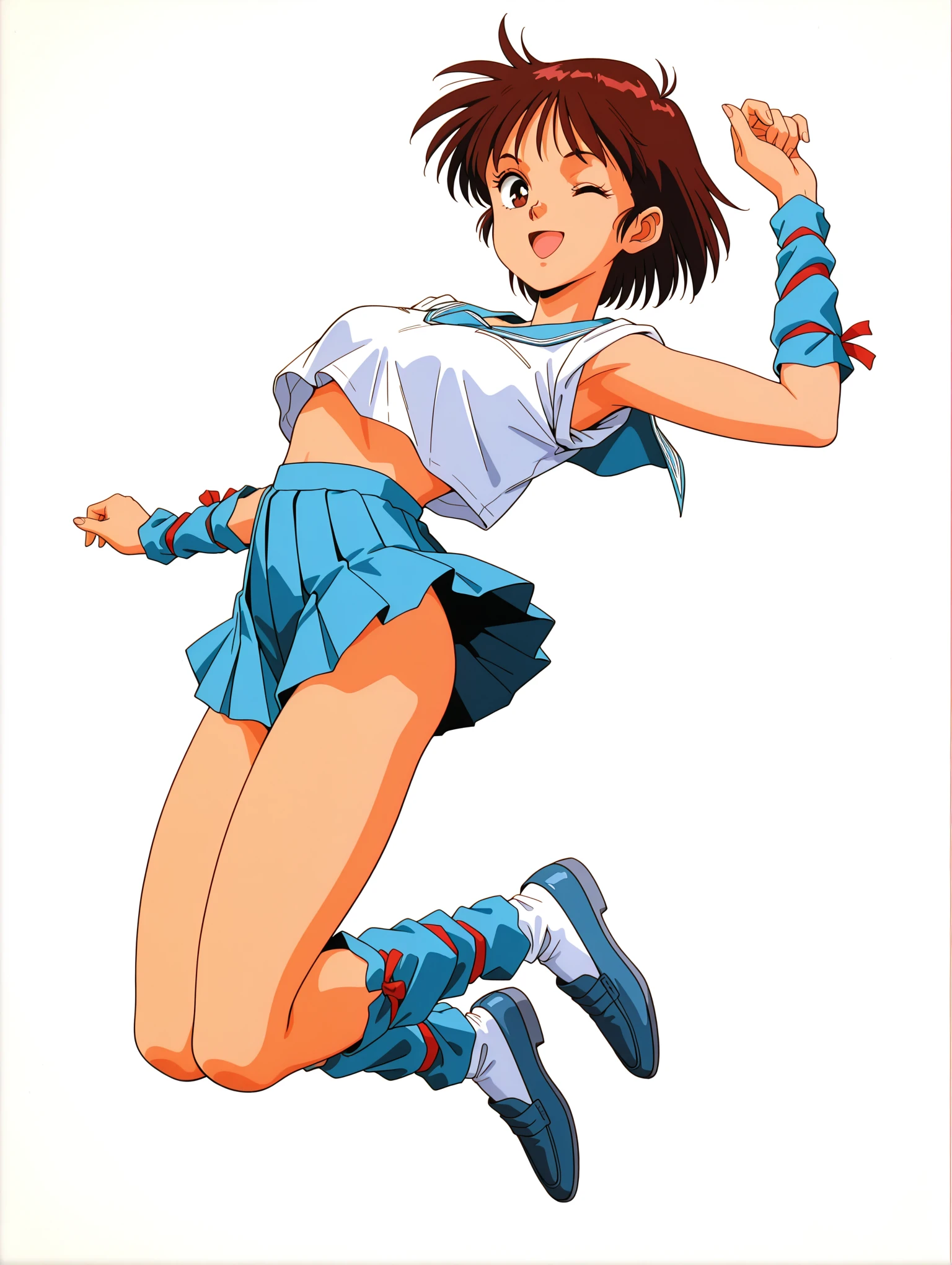 衣装ワード ・m_clothes,blue sailor collar,crop top overhang,sleeves rolled up,arm red ribbon,arm warmers,blue miniskirt,leg red ribbon,blue footwear,loafers,