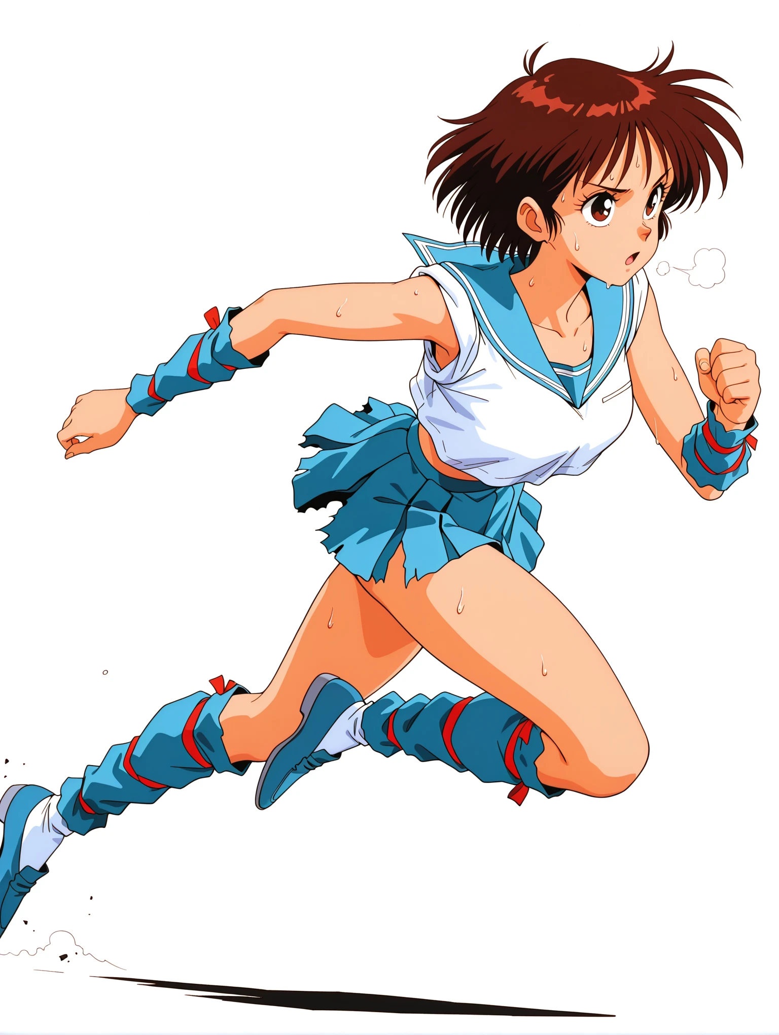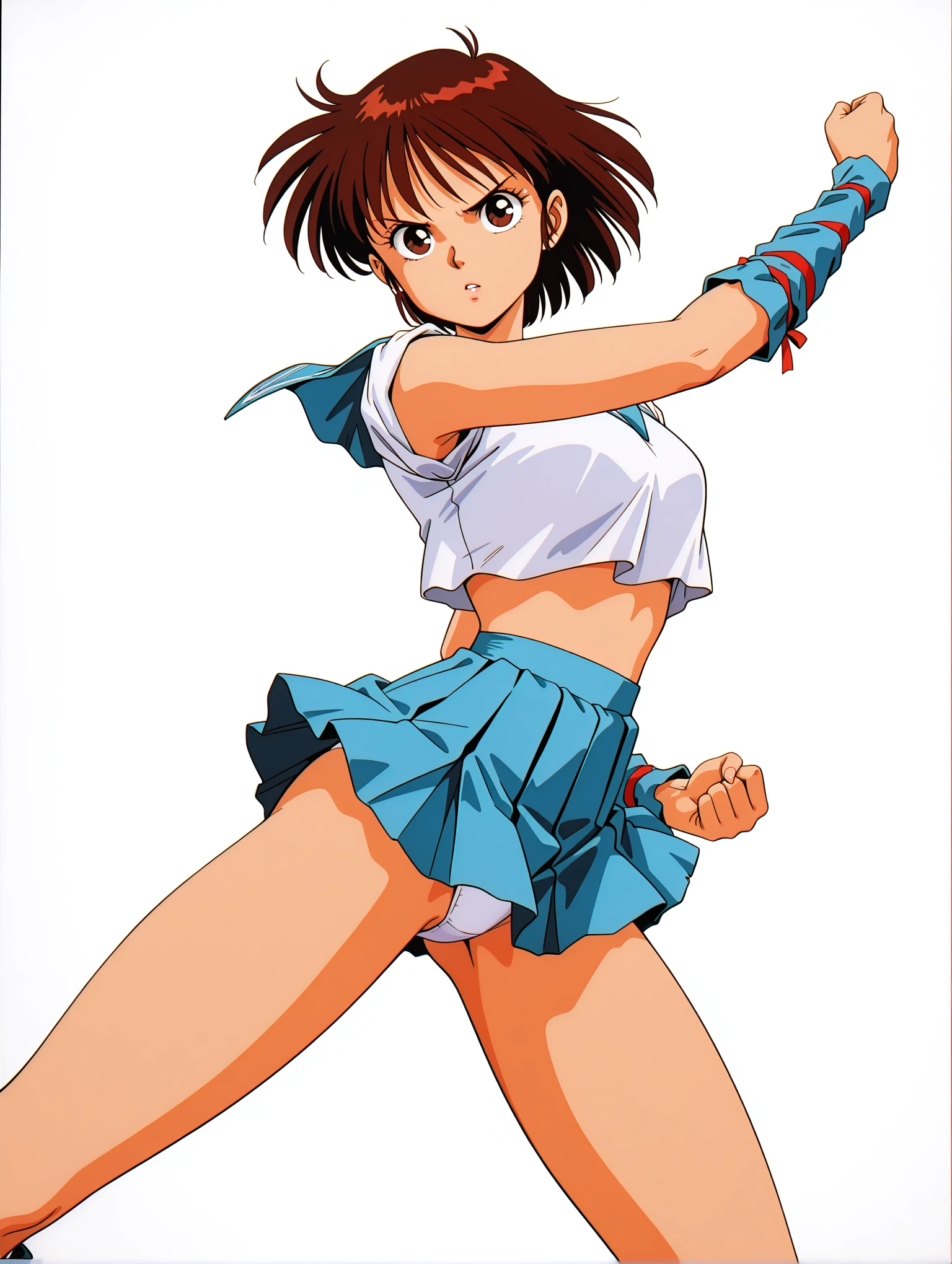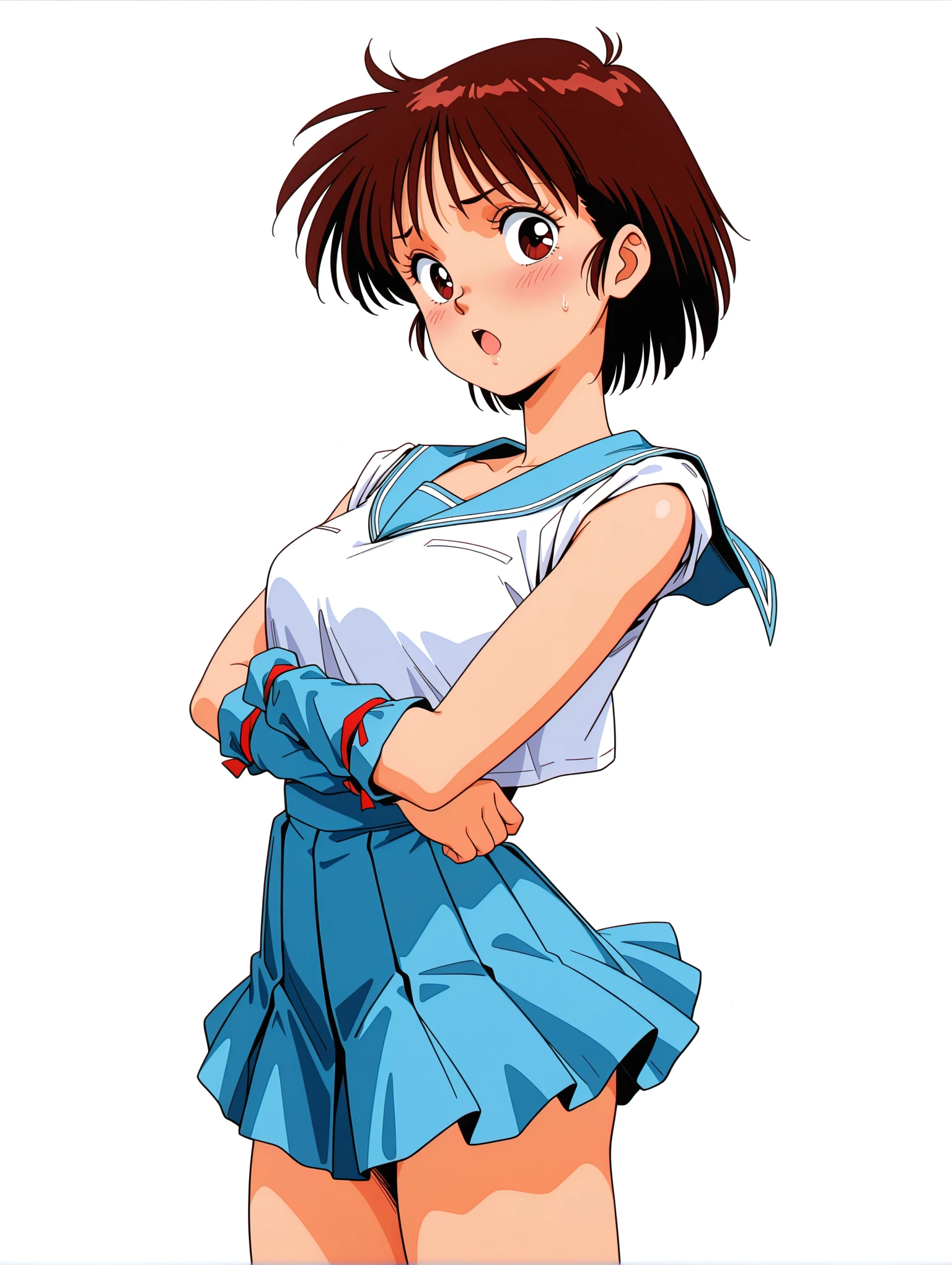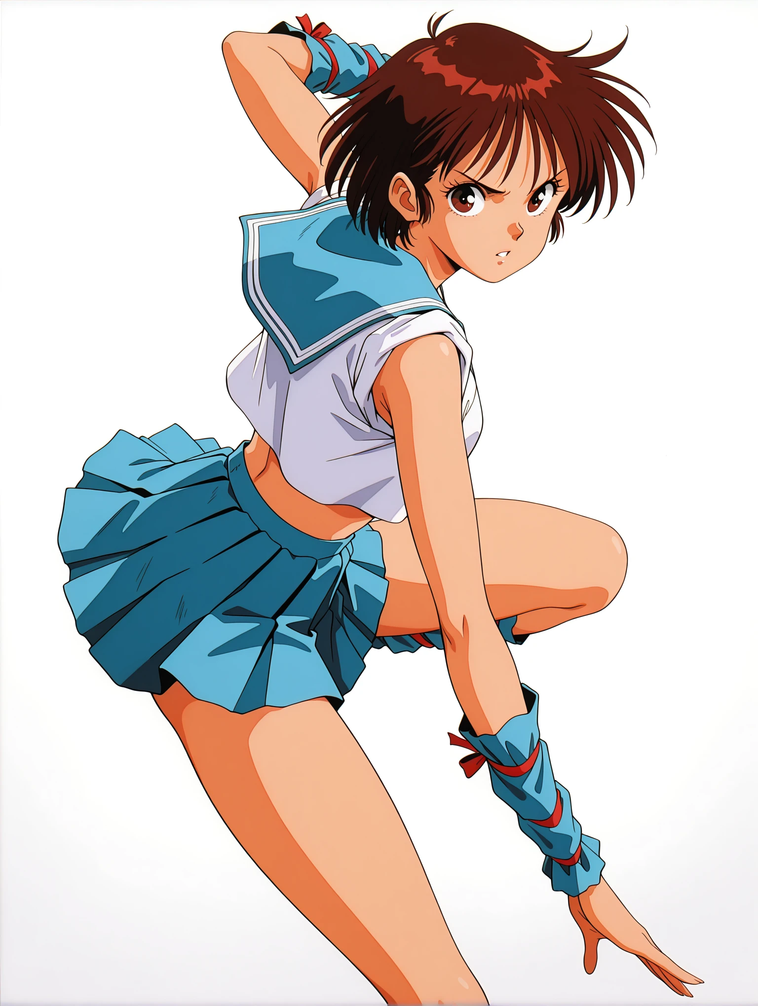 衣装ワード ・m_clothes,blue sailor collar,crop top overhang,sleeves rolled up,arm red ribbon,arm warmers,blue miniskirt,leg red ribbon,blue footwear,loafers,