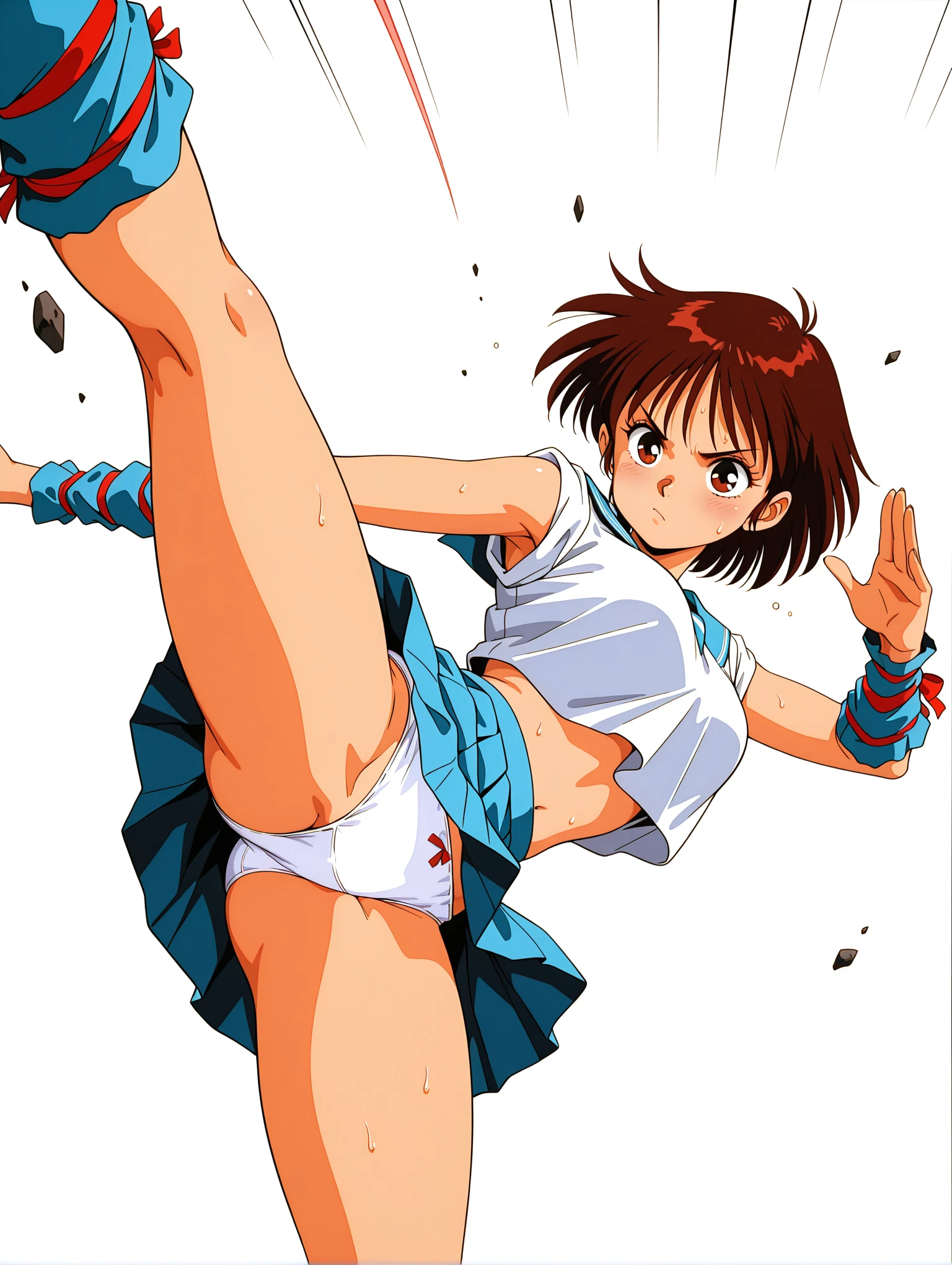 m_clothes,blue sailor collar,crop top overhang,sleeves rolled up,arm red ribbon,arm warmers,blue miniskirt,leg red ribbon,blue footwear,loafers,