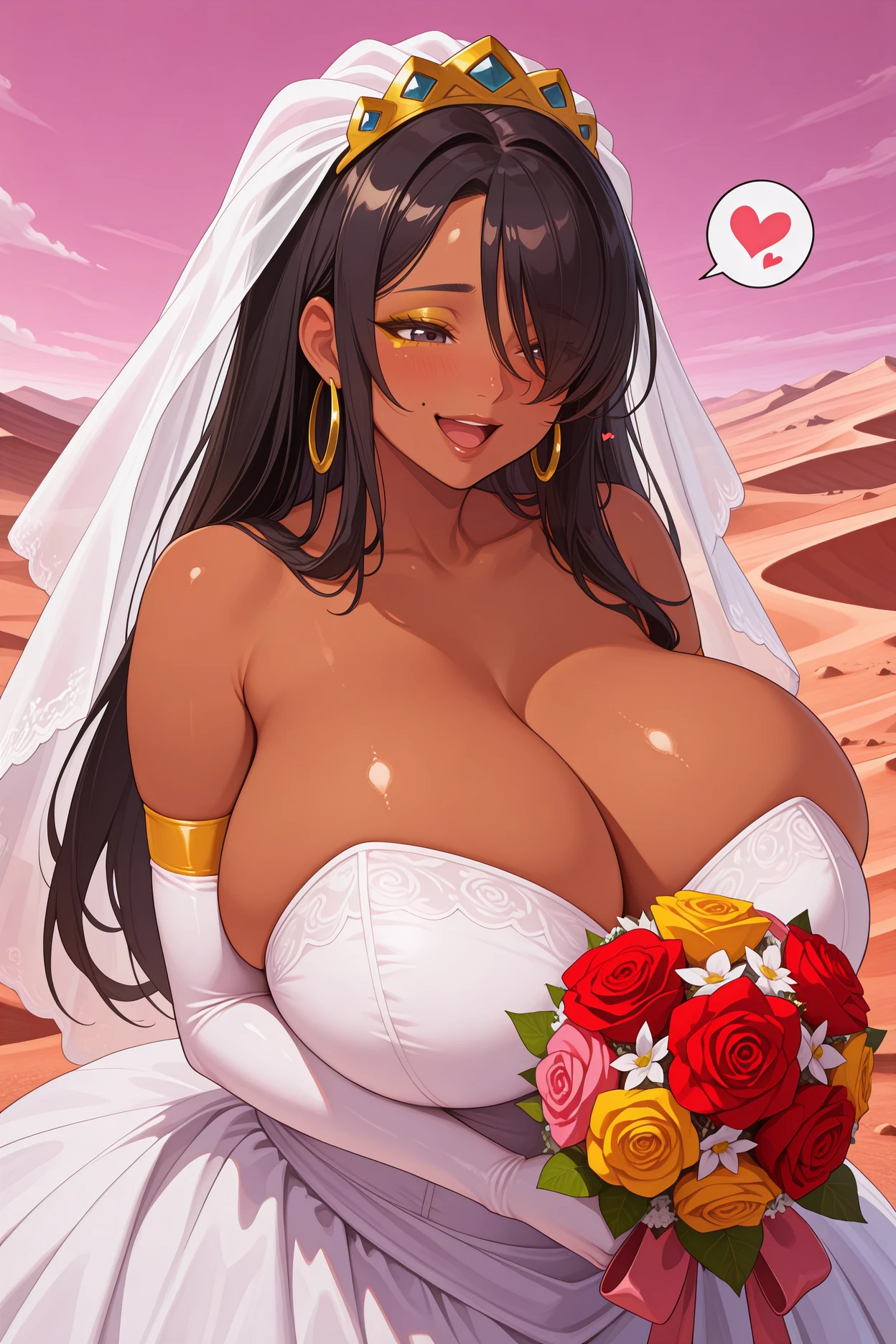 Add "hoop earrings, gold earrings, gold armlet, white dress, halter dress, center opening, pelvic curtain, sideless outfit" for her typical look.