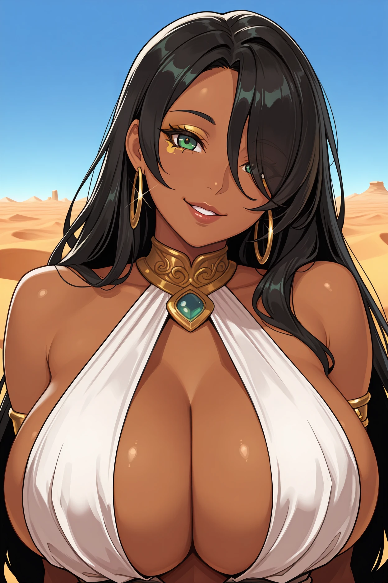 loqofrh, dark-skinned female, black hair, long hair, green eyes, lips, hair over one eye, mature female, yellow eyeshadow, huge breasts