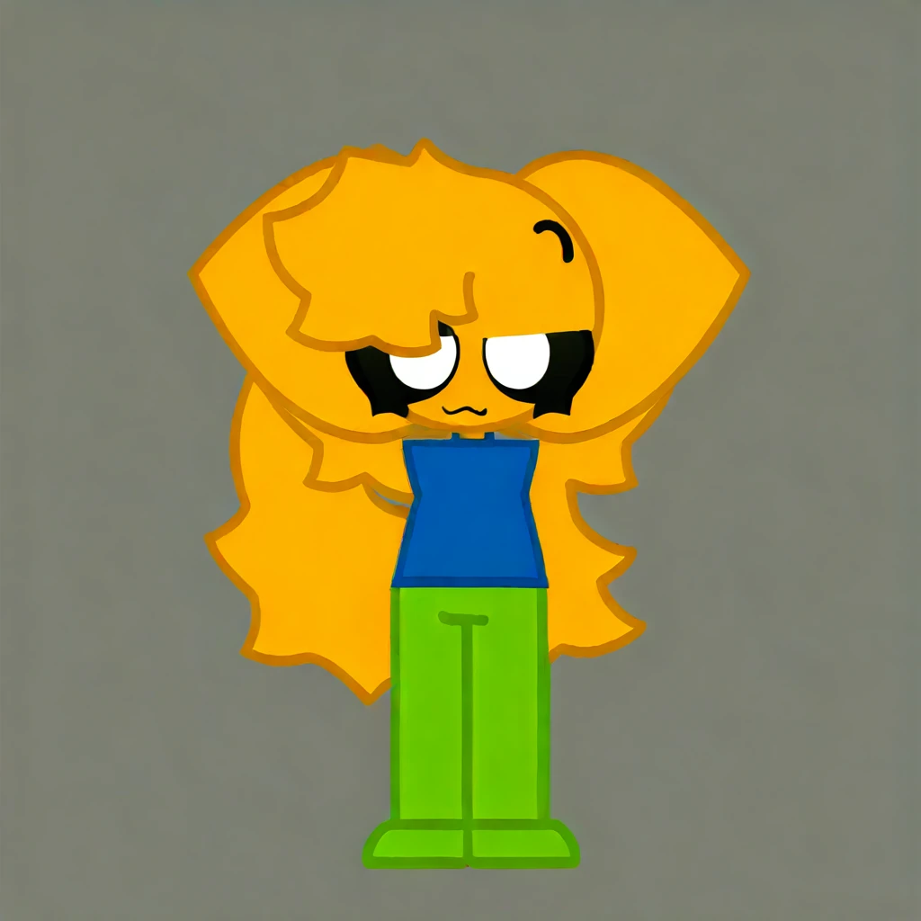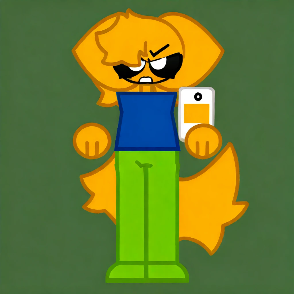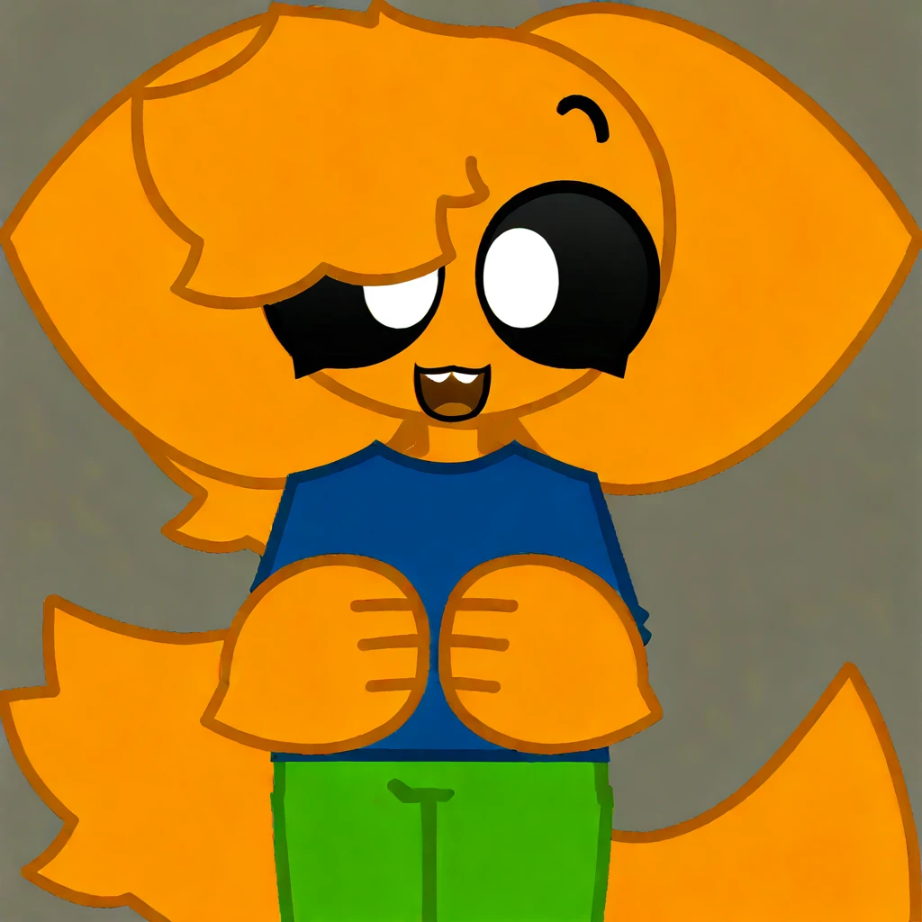 Tanner, cartoony, anthro, furry, limbs, fluffy tail, large heart-shaped ears, black sclera, white pupils, 2 arms, 2 legs, emojicat, fur, fluffy, hair tuff, orange fur, orange skin, blue shirt, green legs (or green pants)