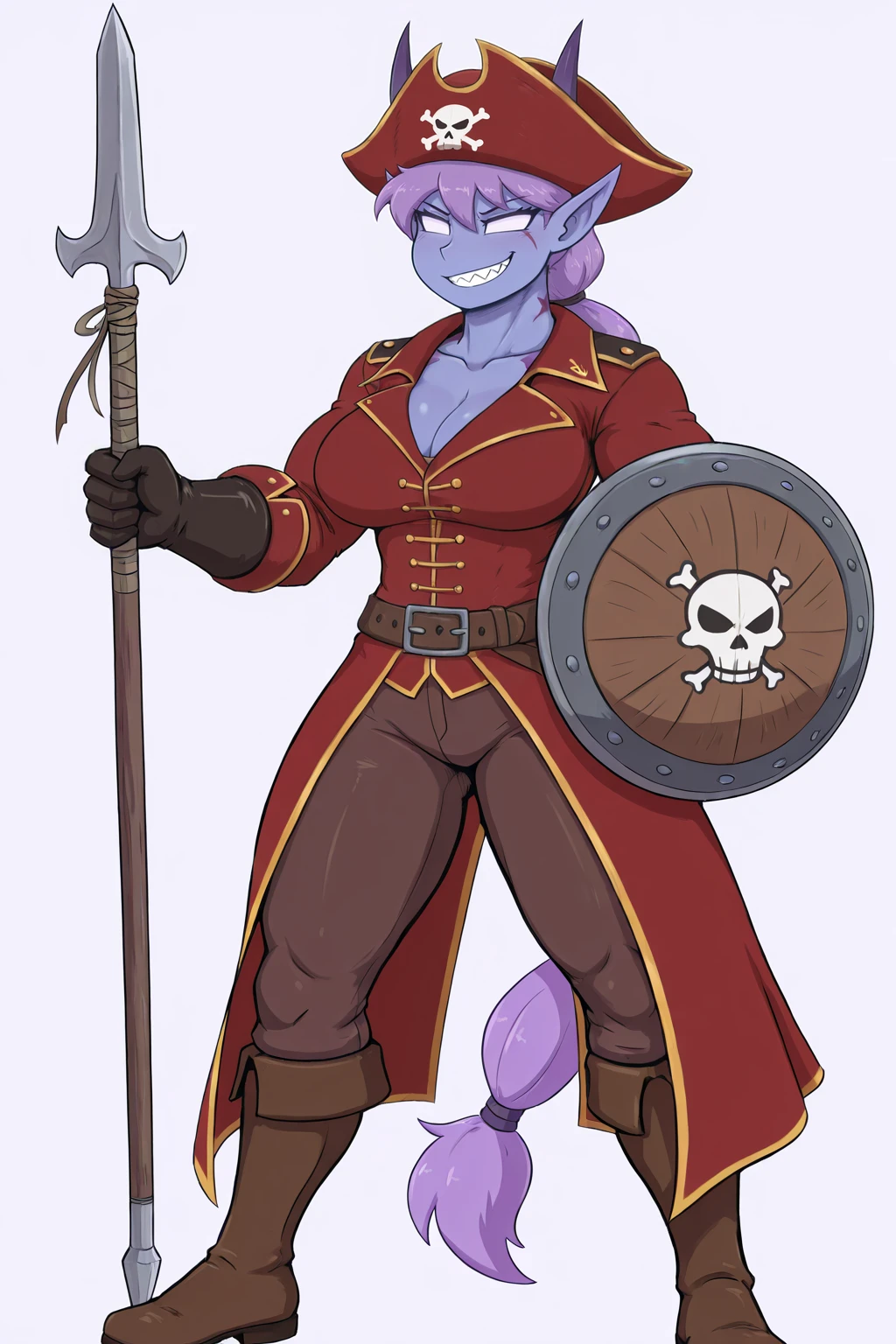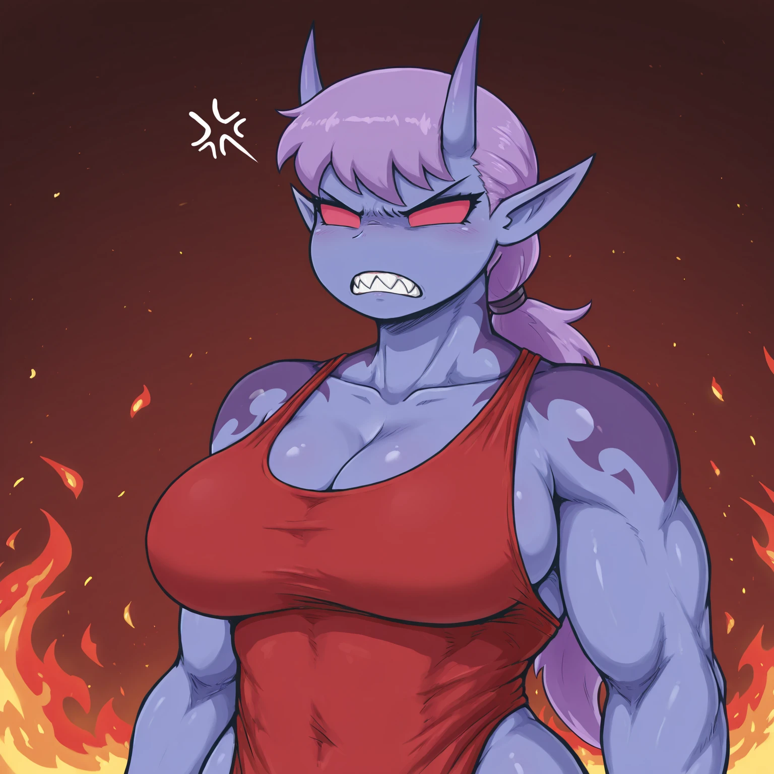 VespaAxugaem, demon girl, blue skin, purple hair, horns, pointy ears, glowing white eyes, no pupils, ponytail, low-tied long hair, feet markings, shoulder markings, fangs, apron