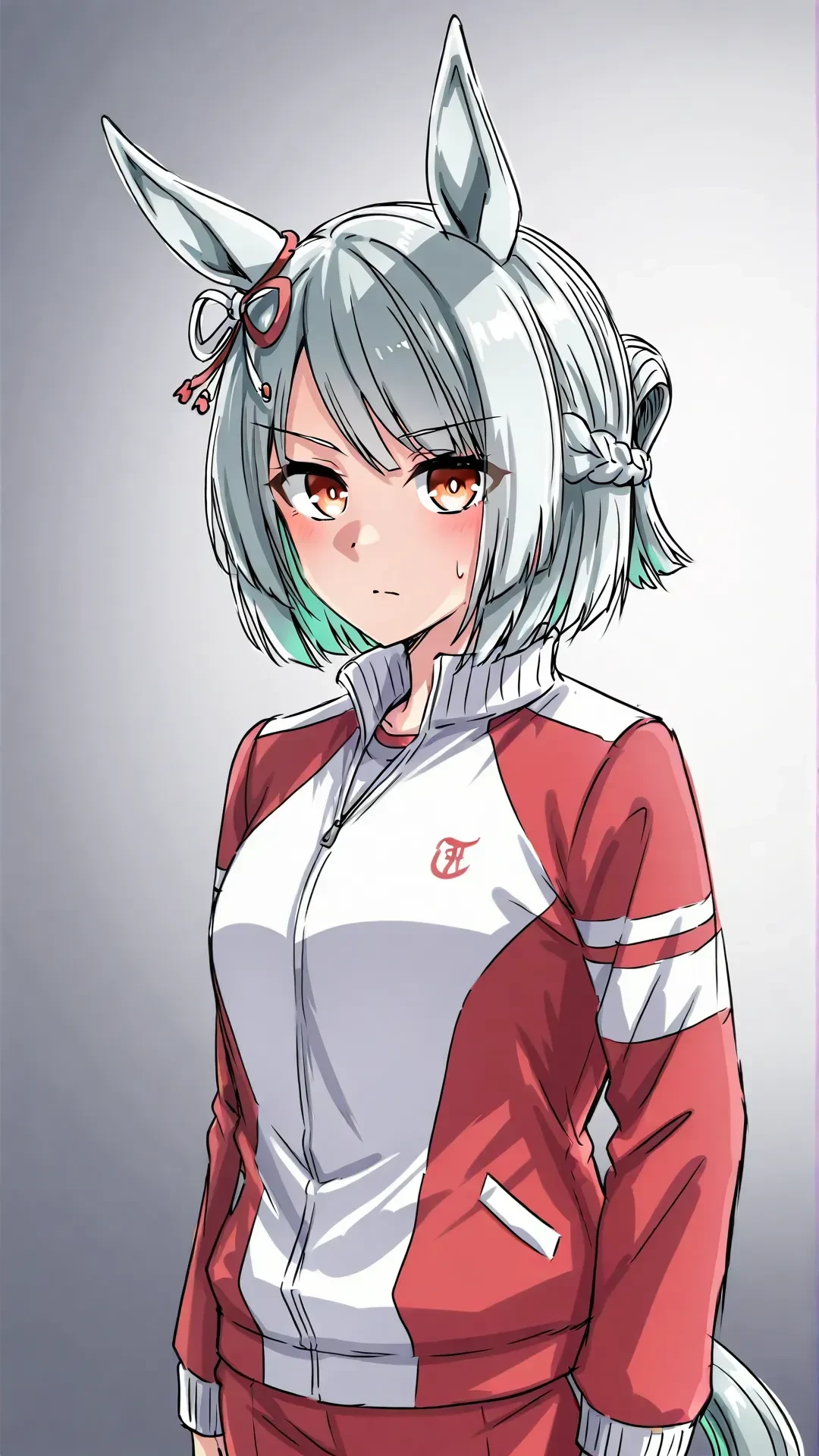 animal ears,green hair,white ribbon,red ribbon,hair ornament,horse girl,horse ears,horse tail,braid,grey hair,short hair,orange eyes,red eyes,short hair,