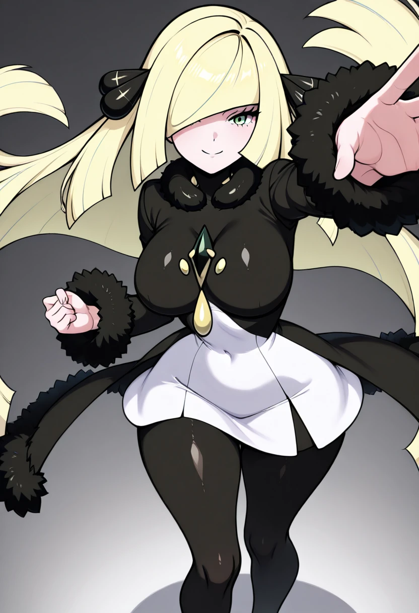 LCynC1tr0n, green eyes, blonde hair, long hair, blunt bangs, hair over one eye, fur-trimmed coat, long sleeves, hair ornament, black coat, white dress, short dress, pantyhose,