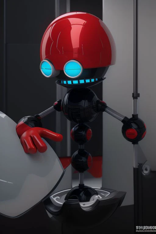 Prompt: Orbot, round head, red robot, red head cap, light blue eyes and mouth, front view, ball joint for a chest and red gloves for hands, arms and back consist each of two thin bars that are joined by a ball joint, lower body is a small semi-sphere with a gray inside and a ball joint connecting it to his back