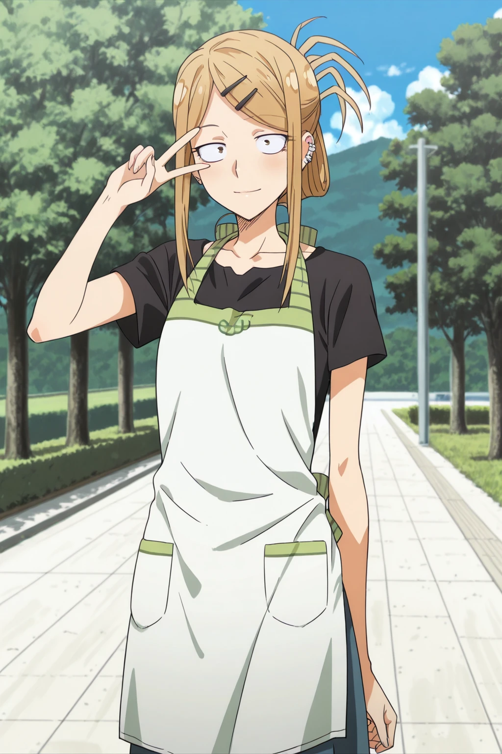 jewelry, earrings, multicolored apron, pattern apron, black shirt, hairclip, ear piercing, skirt, high heels