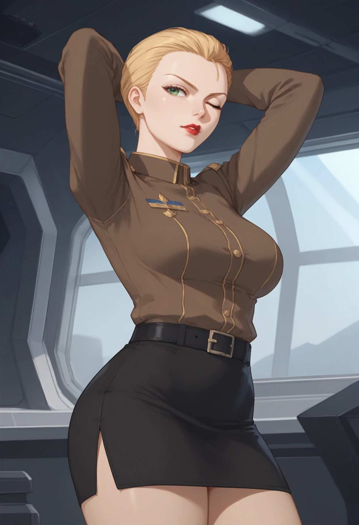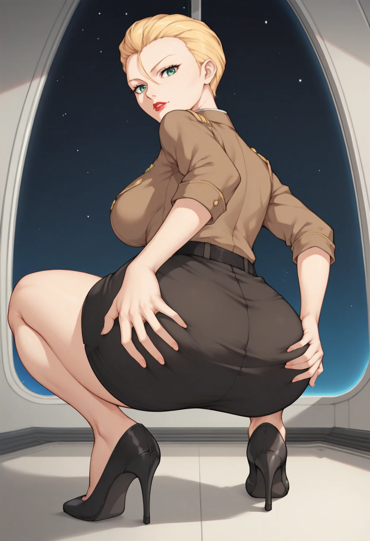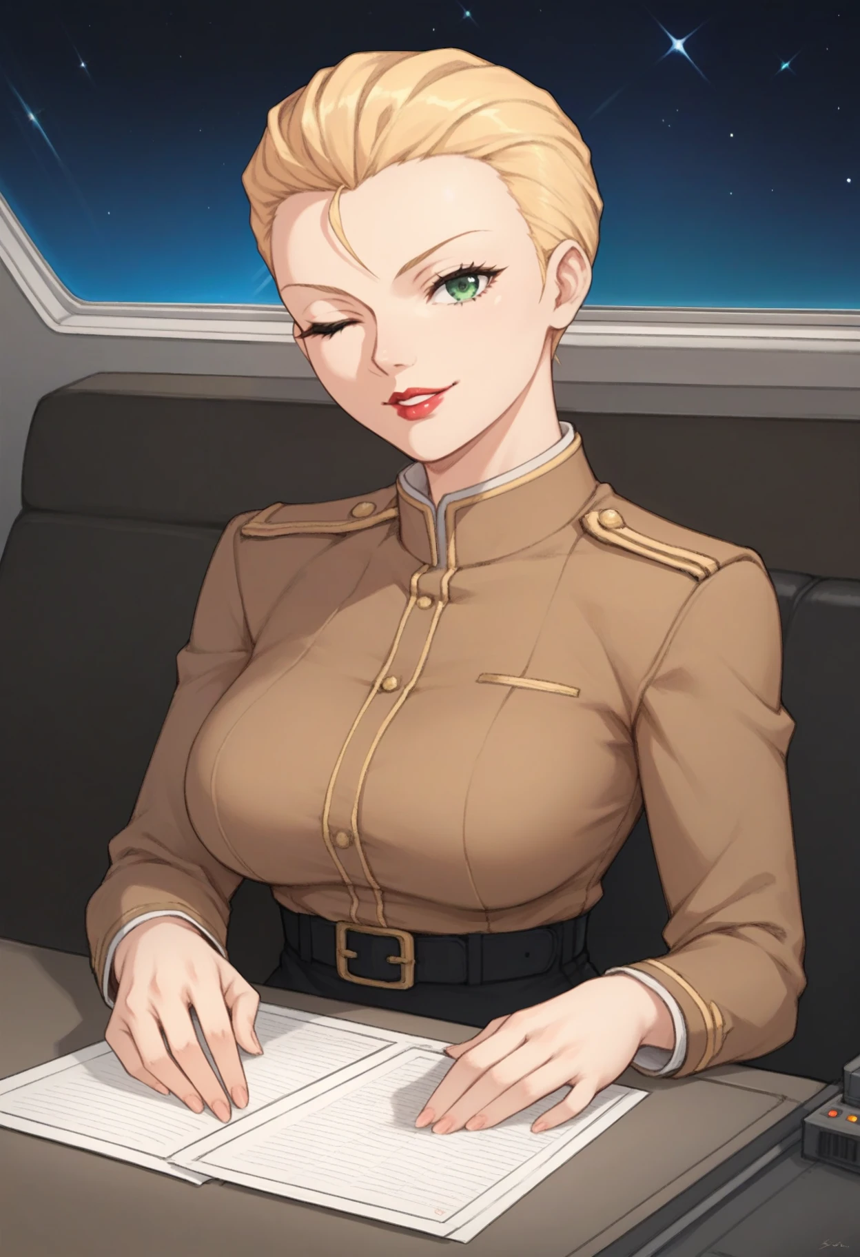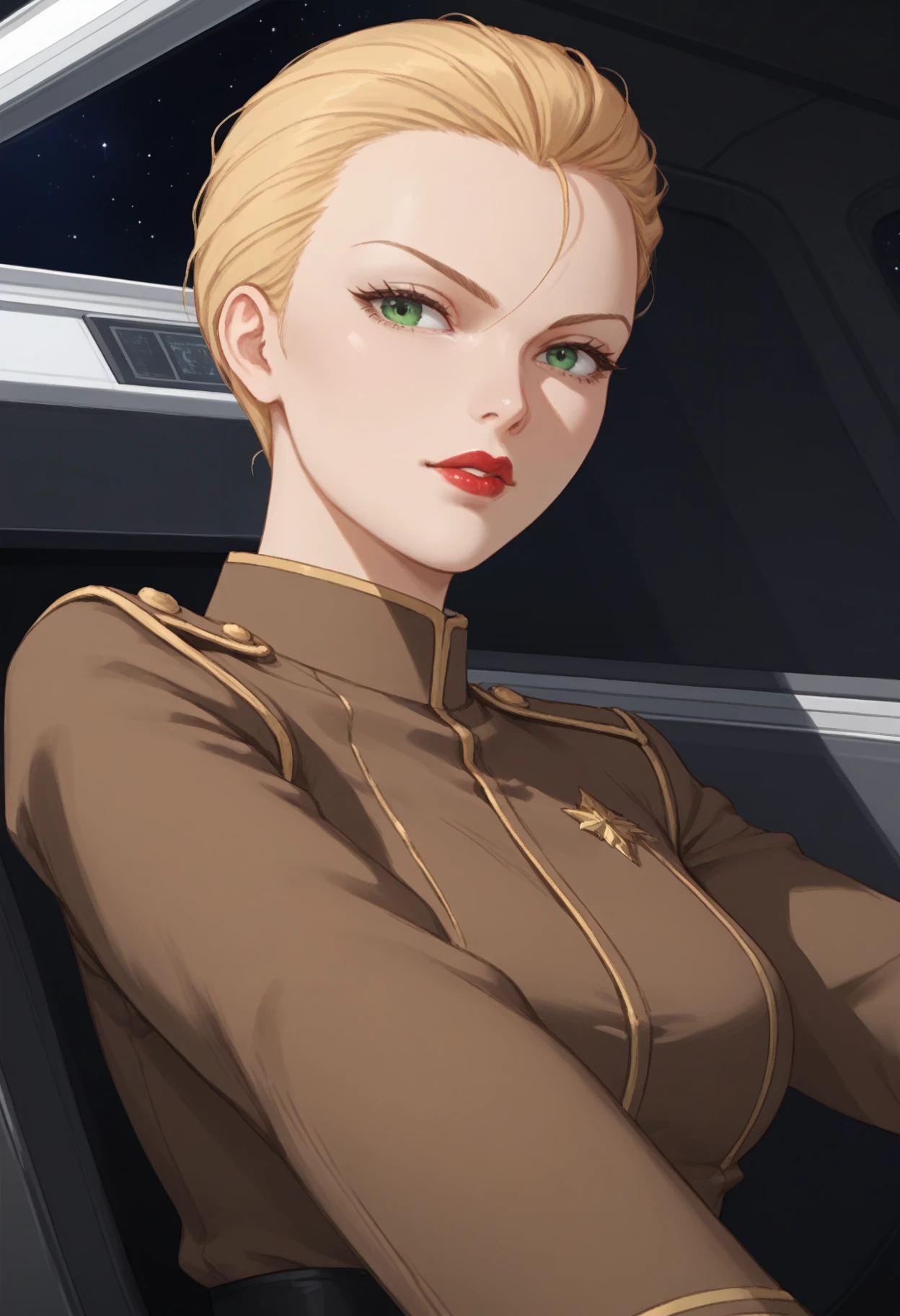 Appearance: MSGSF91LydiaDorfman, 1girl, blonde hair, green eyes, red lips, short hair, hair slicked back, lipstick, parted lips, makeup, forehead, hair between eyes, breasts, aged up,