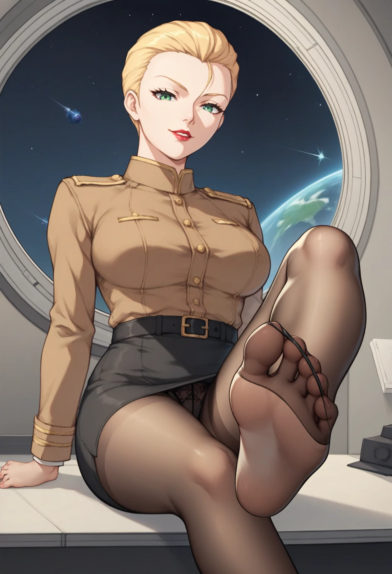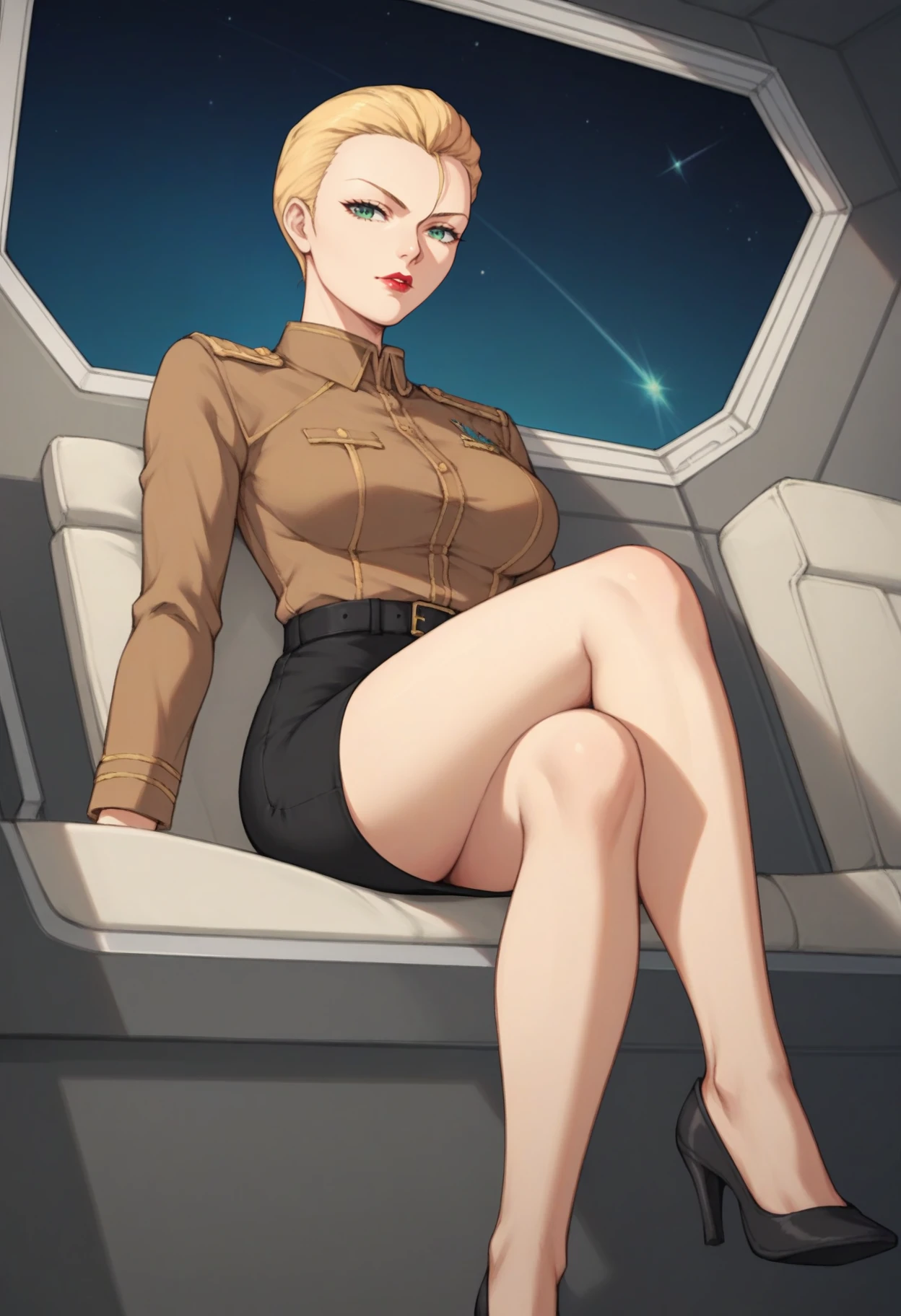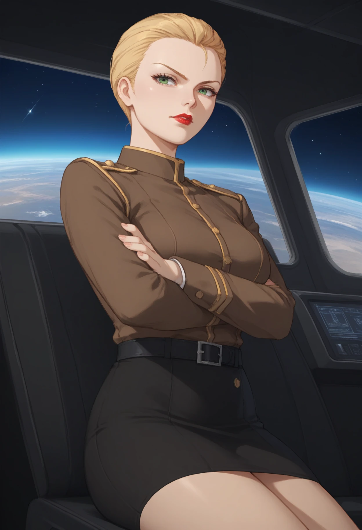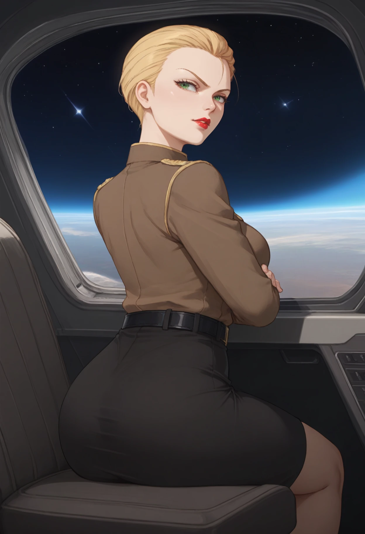 Appearance: MSGSF91LydiaDorfman, 1girl, blonde hair, green eyes, red lips, short hair, hair slicked back, lipstick, parted lips, makeup, forehead, hair between eyes, breasts, aged up,