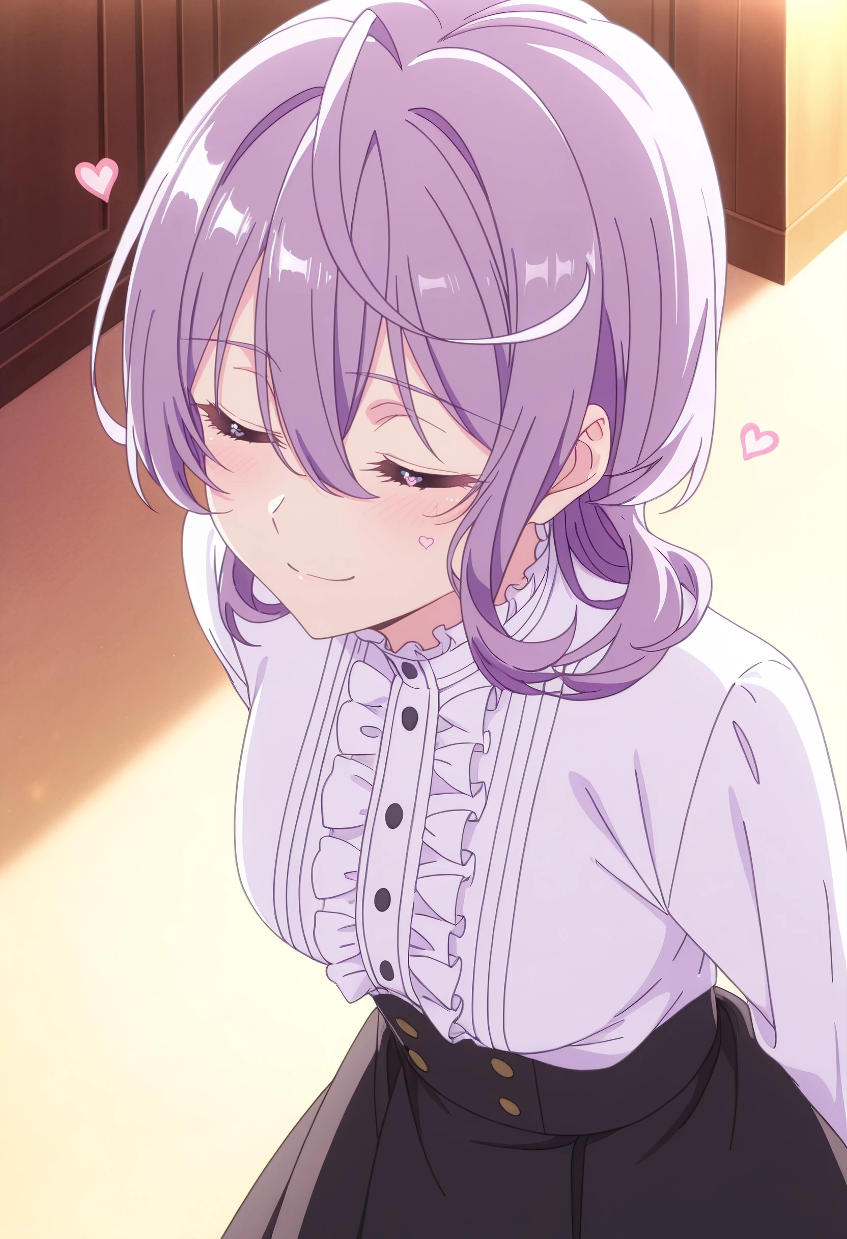 KTPhilia, purple hair, purple eyes, hair between eyes, medium hair, ahoge,